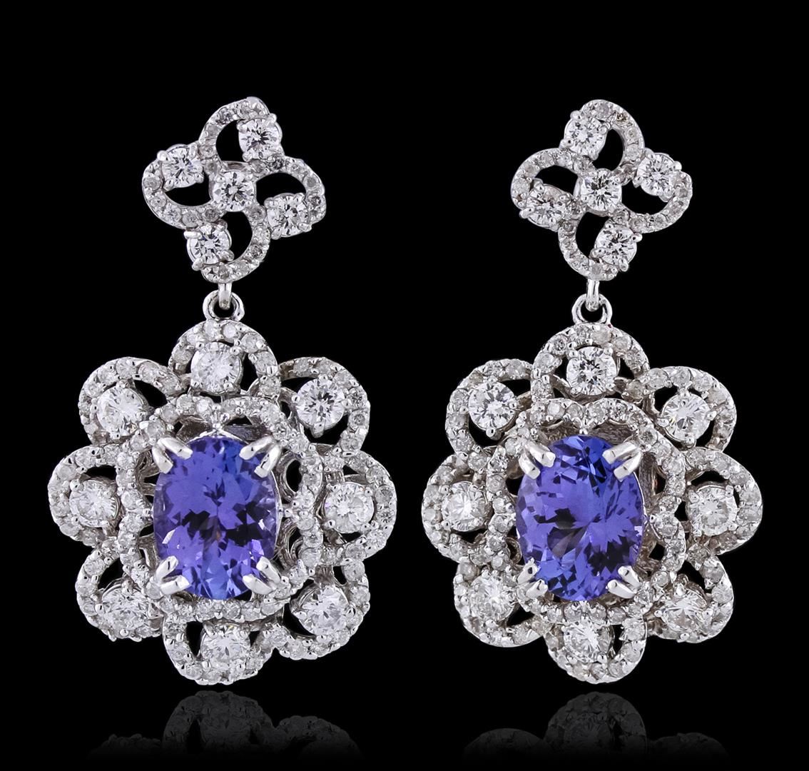 One pair electronically tested 14KT white gold ladies combination cast & assembled dangle earrings with hinged clip backs with a bright polish finish. Condition is new. Identified with markings of "K14". Containing: Two prong set oval modified brilliant cut natural tanzanites, measuring 8.80 x 6.20 x 4.03mm, approximate. Total Weight of 3.04ct., clarity is eye clean, type I, medium light, very slightly grayish, bluish violet color, (GIA bV 4/3), cut is good. Sixteen prong set round brilliant cut diamonds, measuring 2.50 - 2.50 x 1.50mm (depth est.) approximate. Total Weight of 16 Stones = 0.91ct. Clarity: SI-1 to SI-2. Color: I - J, Cut is Good. Ten prong set round brilliant cut diamonds, measuring 2.20 - 2.20 x 1.32mm (depth est.) approximate. Total Weight of 10 Stones = 0.39ct. Clarity: SI-1 to SI-2. Color: H - I, Cut is Good. Two Hundred Sixteen prong set round brilliant cut diamonds, measuring 1.00 - 1.00 x 0.60mm (depth est.) approximate. Total Weight of 216 Stones = 0.78ct. Clarity: I-1 to I-2. Color: I - J, Cut is Good. Colored gemstones are presumed to have been subjected to commonly used enhancement processes. All diamonds and colored gemstones are graded in the mounting, unless otherwise stated. Total Weight of Colored Stones 3.04ct. Total Weight of Diamonds 2.08ct. Total Weight of Earrings 9.80 grams. GGL Appraised at $12,710.00.