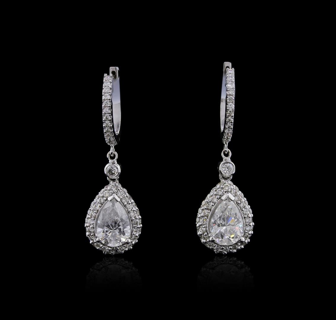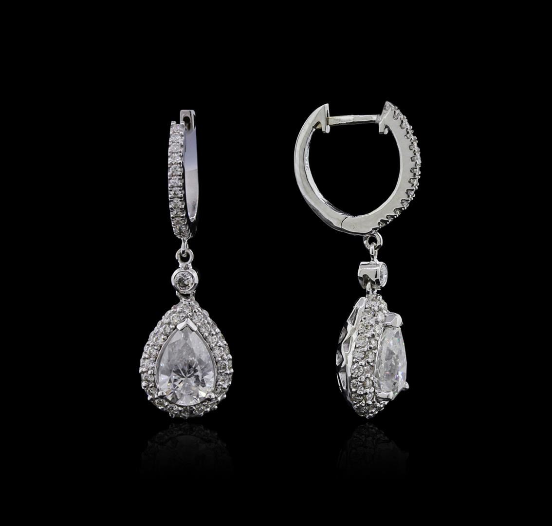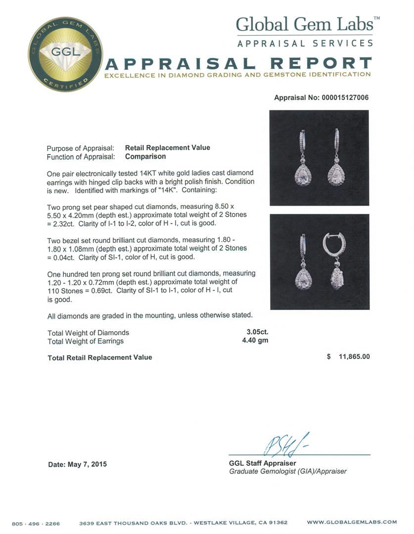 One pair electronically tested 14KT white gold ladies cast diamond earrings with hinged clip backs with a bright polish finish. Identified with markings of "14K". Condition is new. Containing: Two prong set pear shaped cut diamonds, measuring 8.50 x 5.50 x 4.20mm (depth est.) approximate total weight of 2 Stones = 2.32ct. Clarity: I-1 to I-2. Color: H - I, Cut is Good. Two bezel set round brilliant cut diamonds, measuring 1.80 - 1.80 x 1.08mm (depth est.) approximate total weight of 2 Stones = 0.04ct. Clarity: SI-1. Color: H, Cut is Good. One Hundred Ten prong set round brilliant cut diamonds, measuring 1.20 - 1.20 x 0.72mm (depth est.) approximate total weight of 110 Stones = 0.69ct. Clarity: SI-1 to I-1. Color: H - I, Cut is Good. All diamonds are graded in the mounting, unless otherwise stated. Total Weight of Diamonds 3.05ct. Total Weight of Earrings 4.40 grams. GGL Appraised at $11,865.00.