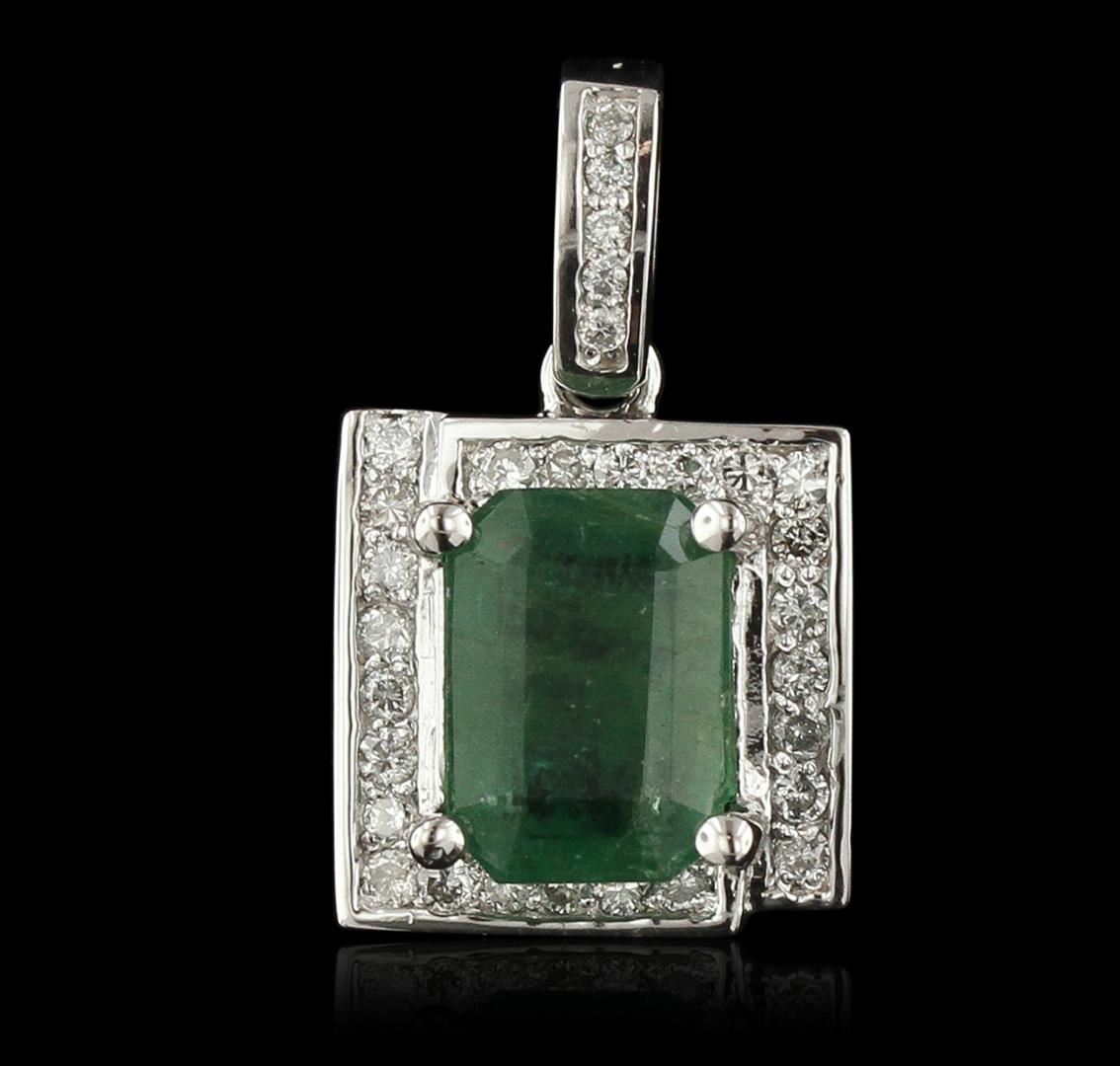 One electronically tested 14KT white gold ladies cast & assembled emerald and diamond pendant with a bright polish finish. Condition is new, good workmanship. The featured emerald is set within a stylized diamond bezel, completed by a diamond set bail. Identified with markings of "14K". Containing: One prong set rectangular step cut natural emerald, measuring 9.95 x 7.10 x 5.00mm, 6% bulge factor, approximate weight of 3.06ct., clarity is heavily included, type III, medium dark, very slightly grayish, very slightly bluish green color, (GIA vslbG 6/3), cut is good. Transmitting light with a minimum of distortion, transparent. Naturally occurring internal & external characteristics are present. Indications of oil residue. graded in the setting. Thirty bead set round brilliant cut diamonds, measuring 1.50 - 1.40 x 0.87mm (depth est.) approximate total weight of 30 Stones = 0.43ct. Graded in the setting. Clarity SI-1 to I-1 Color H - J Total Weight of Colored Stones 3.06ct. Total Weight of Diamonds 0.43ct. Total Weight of Pendant 3.97 grams. AIG appraised at $4,710.00. AIG Appraised at $4,710.00.