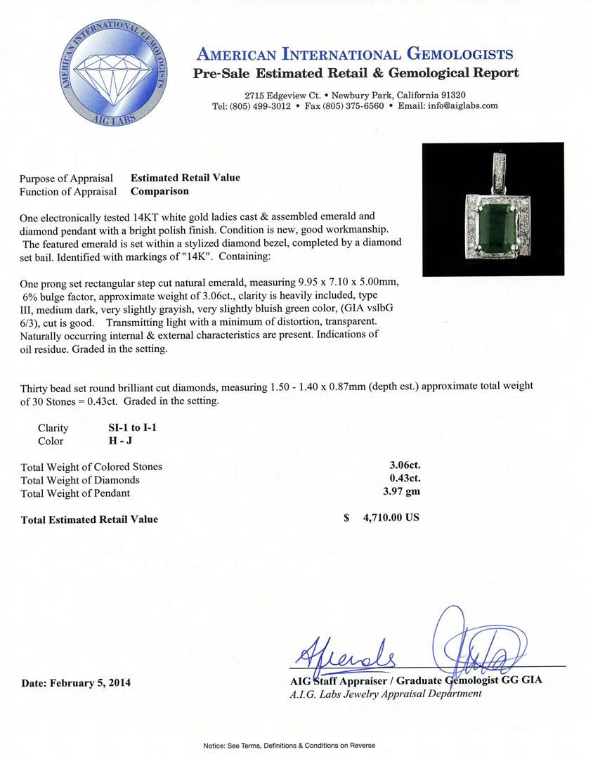 One electronically tested 14KT white gold ladies cast & assembled emerald and diamond pendant with a bright polish finish. Condition is new, good workmanship. The featured emerald is set within a stylized diamond bezel, completed by a diamond set bail. Identified with markings of "14K". Containing: One prong set rectangular step cut natural emerald, measuring 9.95 x 7.10 x 5.00mm, 6% bulge factor, approximate weight of 3.06ct., clarity is heavily included, type III, medium dark, very slightly grayish, very slightly bluish green color, (GIA vslbG 6/3), cut is good. Transmitting light with a minimum of distortion, transparent. Naturally occurring internal & external characteristics are present. Indications of oil residue. graded in the setting. Thirty bead set round brilliant cut diamonds, measuring 1.50 - 1.40 x 0.87mm (depth est.) approximate total weight of 30 Stones = 0.43ct. Graded in the setting. Clarity SI-1 to I-1 Color H - J Total Weight of Colored Stones 3.06ct. Total Weight of Diamonds 0.43ct. Total Weight of Pendant 3.97 grams. AIG appraised at $4,710.00. AIG Appraised at $4,710.00.