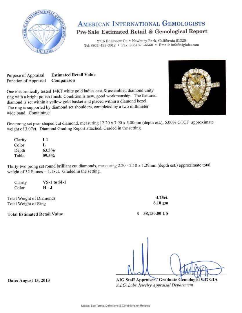 One electronically tested 14KT white gold ladies cast & assembled diamond unity ring with a bright polish finish. Condition is new, good workmanship. The featured diamond is set within a yellow gold basket and placed within a diamond bezel. The ring is supported by diamond set shoulders, completed by a two millimeter wide band. Containing: One prong set pear shaped cut diamond, measuring 12.20 x 7.90 x 5.00mm (depth est.), 5.00% GTCF approximate weight of 3.07ct. Diamond Grading Report attached. Graded in the setting. Clarity I-1. Color L. Depth 63.3%. Table 59.5%. Thirty-two prong set round brilliant cut diamonds, measuring 2.20 - 2.10 x 1.29mm (depth est.) approximate total weight of 32 Stones = 1.18ct. Graded in the setting. Clarity VS-1 to SI-1. Color H -- J. Total Weight of Diamonds 4.25ct. Total Weight of Ring 6.10gm. AIG Appraised.