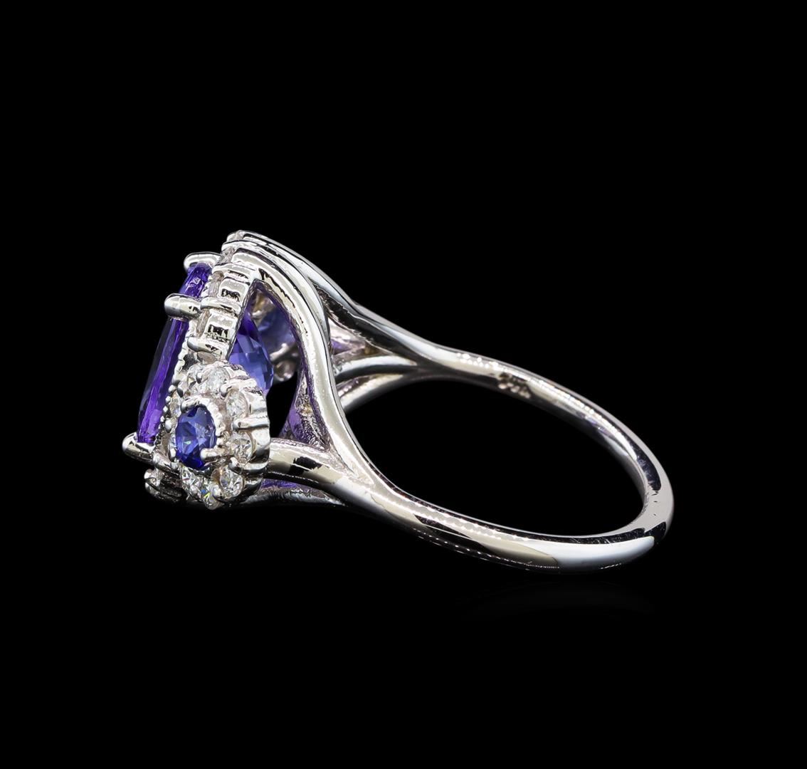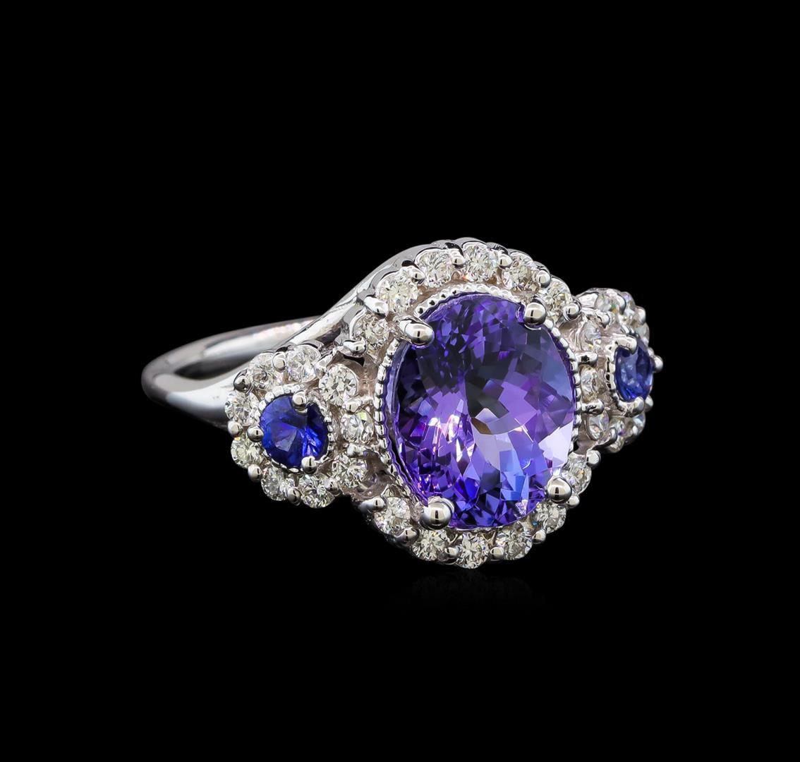 One electronically tested 14KT white gold ladies cast tanzanite, sapphire and diamond ring with a bright polish finish. Identified with markings of "14K". Condition is new. Containing: One prong set oval modified brilliant cut natural tanzanite, measuring 10.00. x 8.20 x 5.33mm, approximate weight of 3.07ct., clarity is eye clean, type I, medium light, very slightly grayish, violet color, (GIA V 4/3), cut is good. Two prong set round modified brilliant cut natural blue sapphires, measuring 3.50 - 3.50 x 2.28 mm, approximate total weight of 0.44ct., clarity is moderately included, type II, medium, moderately strong, blue color, (GIA B 5/4), cut is good. Thirty prong set round brilliant cut diamonds, measuring 1.50 - 1.50 x 0.90mm (depth est.) approximate total weight of 30 Stones = 0.37ct. Clarity: SI-1 to I-1. Color: I - J, Cut is Good. Colored gemstones are presumed to have been subjected to commonly used enhancement processes. All diamonds and colored gemstones are graded in the mounting, unless otherwise stated. Total Weight of Colored Stones 3.51ct. Total Weight of Diamonds 0.37ct. Total Weight of Ring 6.20 grams. GGL Appraised at $4,745.00.
