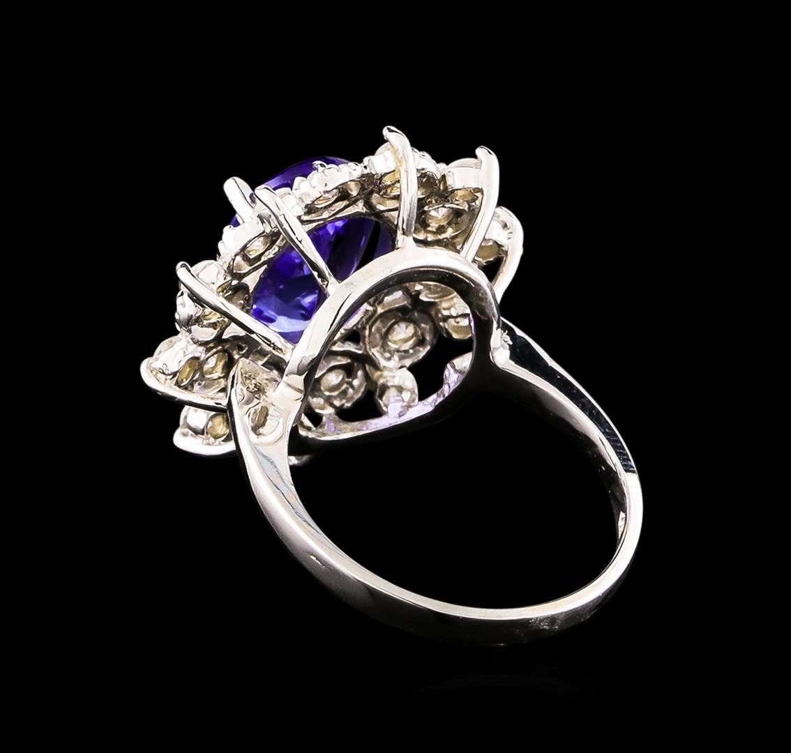 One electronically tested 14KT white gold Ladies cast ring with a bright polish finish. Condition is new. Identified with markings of "14K". Containing: One prong set oval modified brilliant cut natural tanzanite, measuring 11.15 x 8.20 x 4.90mm, approximate weight of 3.07ct., clarity is eye clean, type I, medium, moderately strong, violet color, (GIA V 5/4), cut is good. Colored gemstones are presumed to have been subjected to commonly used color/clarity enhancement processes. Twenty prong set round brilliant cut diamonds, measuring 2.00 - 2.00 x 1.20mm (depth est.) approximate. Total Weight of 20 Stones = 0.58ct. Clarity: I-1 to I-2. Color: H - I, Cut is Good. All grading of diamonds and colored gemstones in this piece of jewelry are graded in the mounting, unless otherwise stated. Total Weight of Colored Stones 3.07ct. Total Weight of Diamonds 0.58ct. Total Weight of Ring 5.90 grams. GGL Appraised at $7,275.00.