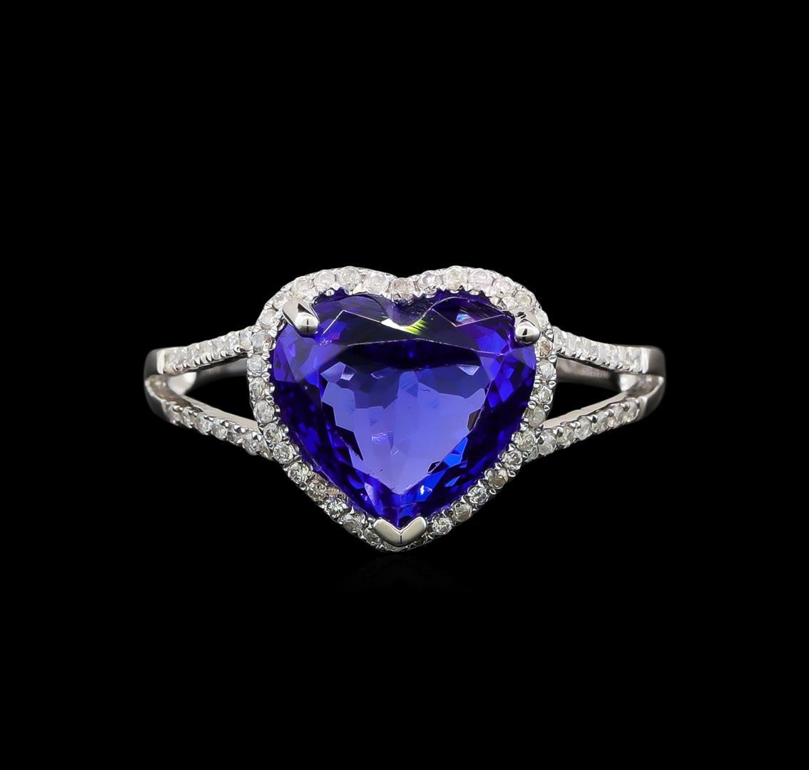 One electronically tested 14KT white gold ladies cast tanzanite and diamond ring with a split shank with a bright polish finish. Trademark is Orianne. Identified with markings of "14K". Condition is new. Containing: One prong set heart modified brilliant cut natural tanzanite, measuring 8.23 x 9.98 x 5.73mm, approximate weight of 3.07ct., clarity is eye clean, type I, medium, moderately strong, violetish blue color, (GIA vB 5/4), cut is good. Sixty-Eight prong set round brilliant cut diamonds, measuring 1.00 - 1.00 x 0.60mm (depth est.) approximate total weight of 68 Stones = 0.25ct. Clarity: I-1 to I-2. Color: I - J. All diamonds and colored gemstones are graded in the mounting, unless otherwise stated. Colored gemstones are presumed to have been subjected to commonly used enhancement processes. Total Weight of Colored Stones 3.07ct. Total Weight of Diamonds 0.25ct. Total Weight of Ring 3.00 grams. GGL Appraised at $4,035.00.
