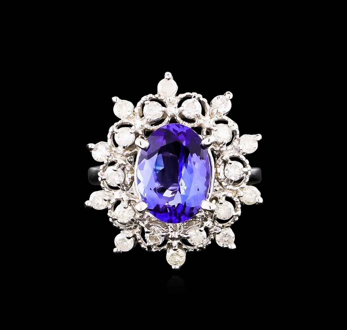 One electronically tested 14KT white gold Ladies cast ring with a bright polish finish. Condition is new. Identified with markings of "14K". Containing: One prong set oval modified brilliant cut natural tanzanite, measuring 11.15 x 8.20 x 4.90mm, approximate weight of 3.07ct., clarity is eye clean, type I, medium, moderately strong, violet color, (GIA V 5/4), cut is good. Colored gemstones are presumed to have been subjected to commonly used color/clarity enhancement processes. Twenty prong set round brilliant cut diamonds, measuring 2.00 - 2.00 x 1.20mm (depth est.) approximate. Total Weight of 20 Stones = 0.58ct. Clarity: I-1 to I-2. Color: H - I, Cut is Good. All grading of diamonds and colored gemstones in this piece of jewelry are graded in the mounting, unless otherwise stated. Total Weight of Colored Stones 3.07ct. Total Weight of Diamonds 0.58ct. Total Weight of Ring 5.90 grams. GGL Appraised at $7,275.00.