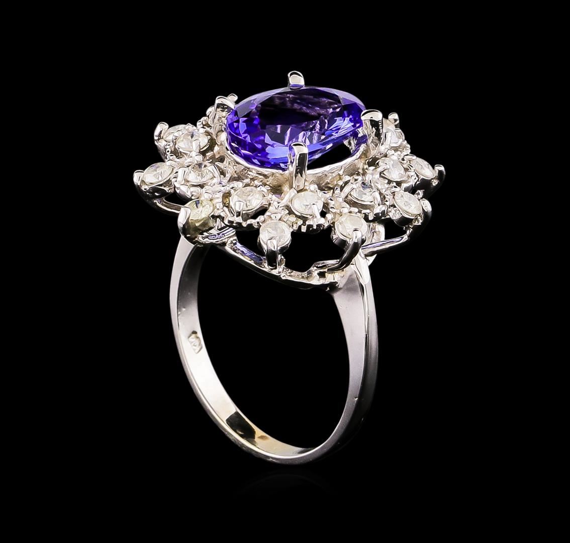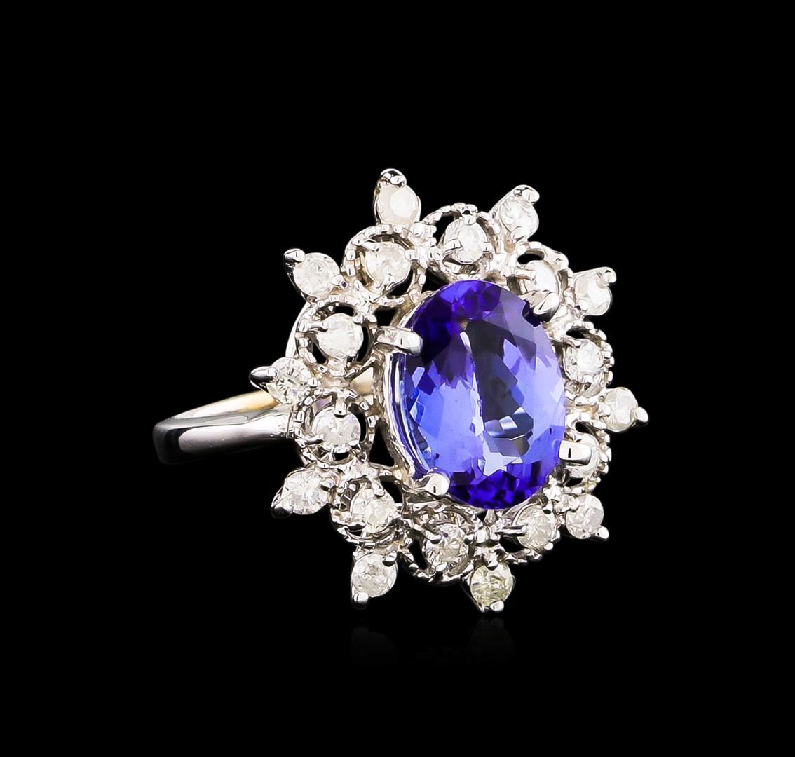 One electronically tested 14KT white gold Ladies cast ring with a bright polish finish. Condition is new. Identified with markings of "14K". Containing: One prong set oval modified brilliant cut natural tanzanite, measuring 11.15 x 8.20 x 4.90mm, approximate weight of 3.07ct., clarity is eye clean, type I, medium, moderately strong, violet color, (GIA V 5/4), cut is good. Colored gemstones are presumed to have been subjected to commonly used color/clarity enhancement processes. Twenty prong set round brilliant cut diamonds, measuring 2.00 - 2.00 x 1.20mm (depth est.) approximate. Total Weight of 20 Stones = 0.58ct. Clarity: I-1 to I-2. Color: H - I, Cut is Good. All grading of diamonds and colored gemstones in this piece of jewelry are graded in the mounting, unless otherwise stated. Total Weight of Colored Stones 3.07ct. Total Weight of Diamonds 0.58ct. Total Weight of Ring 5.90 grams. GGL Appraised at $7,275.00.