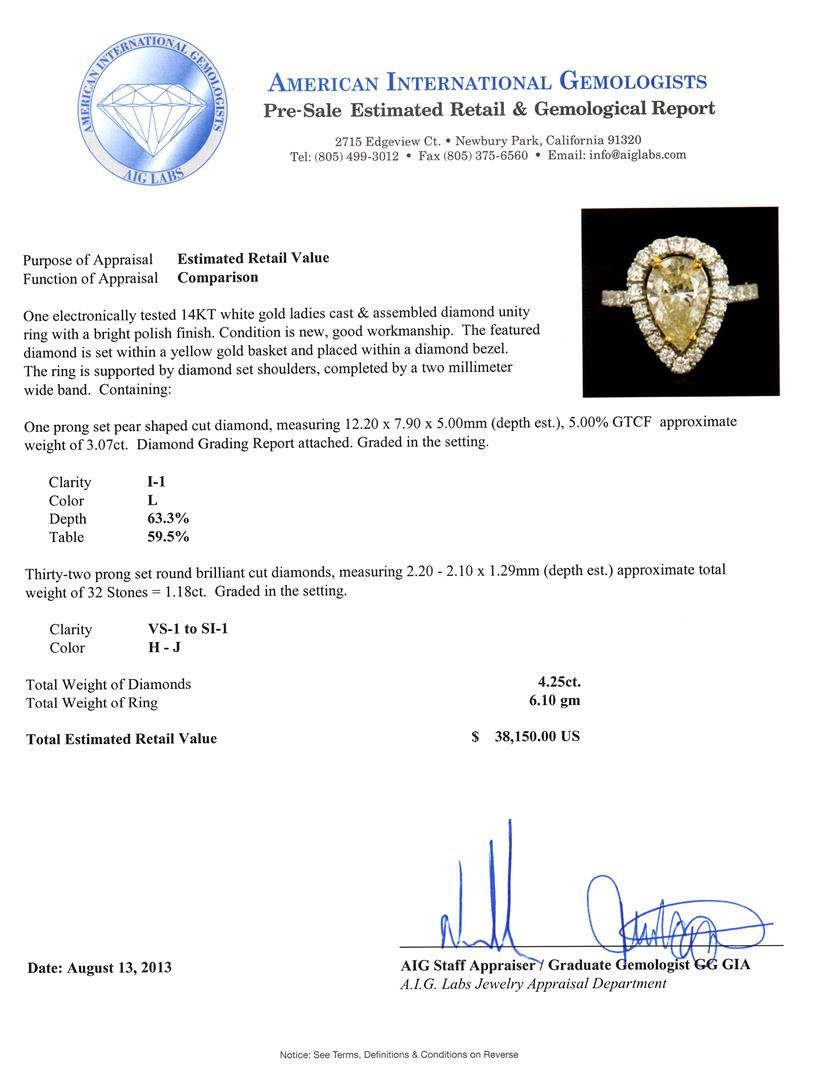 One electronically tested 14KT white gold ladies cast & assembled diamond unity ring with a bright polish finish. Condition is new, good workmanship. The featured diamond is set within a yellow gold basket and placed within a diamond bezel. The ring is supported by diamond set shoulders, completed by a two millimeter wide band. Containing: One prong set pear shaped cut diamond, measuring 12.20 x 7.90 x 5.00mm (depth est.), 5.00% GTCF approximate weight of 3.07ct. Diamond Grading Report attached. Graded in the setting. Clarity I-1. Color L. Depth 63.3%. Table 59.5%. Thirty-two prong set round brilliant cut diamonds, measuring 2.20 - 2.10 x 1.29mm (depth est.) approximate total weight of 32 Stones = 1.18ct. Graded in the setting. Clarity VS-1 to SI-1. Color H -- J. Total Weight of Diamonds 4.25ct. Total Weight of Ring 6.10gm. AIG Appraised at $38,150.00.