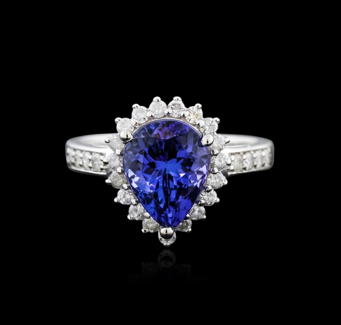 One electronically tested 14KT white gold ladies cast tanzanite and diamond ring with a bright polish finish. Identified with markings of "14K". Condition is new. Containing: One prong set pear modified brilliant cut natural tanzanite, measuring 11.00 x 8.00 x 5.20mm, approximate weight of 3.07ct., clarity is eye clean, type I, medium dark, very slightly grayish, blue color, (GIA B 6/3), cut is good. Twenty-Seven prong set round brilliant cut diamonds, measuring 1.50 - 1.50 x 0.90mm (depth est.) approximate total weight of 27 Stones = 0.33ct. Clarity: SI-2 to I-2. Color: I - J. Colored gemstones are presumed to have been subjected to commonly used enhancement processes. All diamonds and colored gemstones are graded in the mounting, unless otherwise stated. Total Weight of Colored Stones 3.07ct. Total Weight of Diamonds 0.33ct. Total Weight of Ring 4.00 grams. GGL Appraised at $3,630.00.