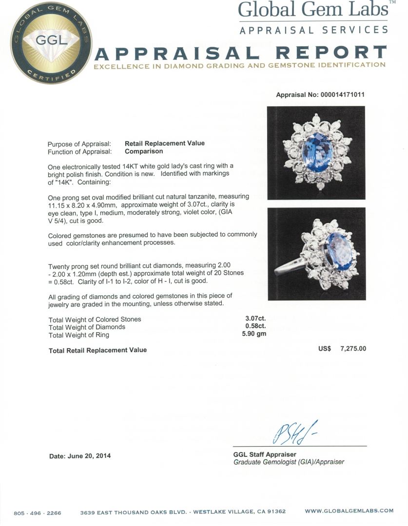 One electronically tested 14KT white gold Ladies cast ring with a bright polish finish. Condition is new. Identified with markings of "14K". Containing: One prong set oval modified brilliant cut natural tanzanite, measuring 11.15 x 8.20 x 4.90mm, approximate weight of 3.07ct., clarity is eye clean, type I, medium, moderately strong, violet color, (GIA V 5/4), cut is good. Colored gemstones are presumed to have been subjected to commonly used color/clarity enhancement processes. Twenty prong set round brilliant cut diamonds, measuring 2.00 - 2.00 x 1.20mm (depth est.) approximate. Total Weight of 20 Stones = 0.58ct. Clarity: I-1 to I-2. Color: H - I, Cut is Good. All grading of diamonds and colored gemstones in this piece of jewelry are graded in the mounting, unless otherwise stated. Total Weight of Colored Stones 3.07ct. Total Weight of Diamonds 0.58ct. Total Weight of Ring 5.90 grams. GGL Appraised at $7,275.00.