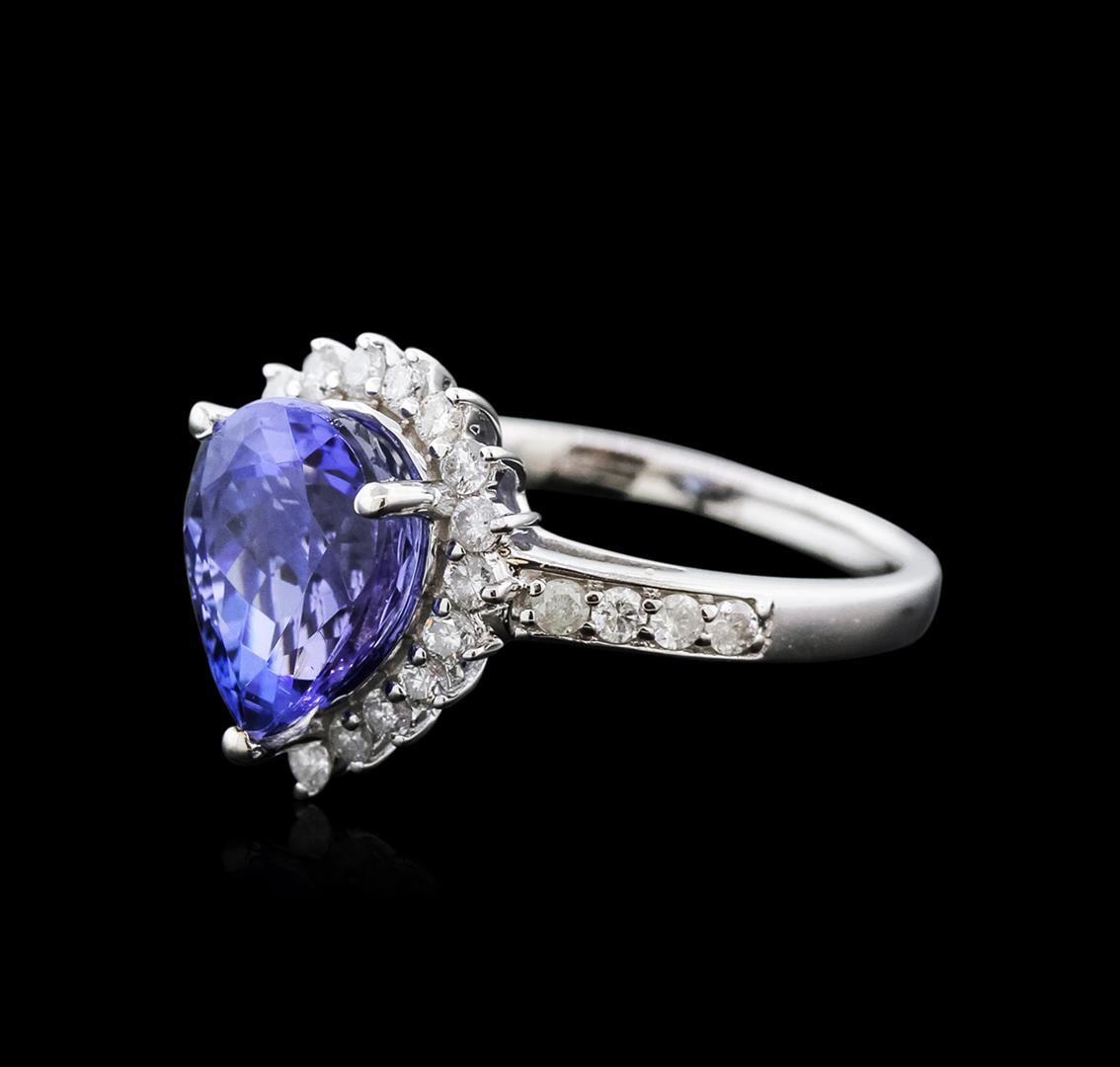 One electronically tested 14KT white gold ladies cast tanzanite and diamond ring with a bright polish finish. Identified with markings of "14K". Condition is new. Containing: One prong set pear modified brilliant cut natural tanzanite, measuring 11.00 x 8.00 x 5.20mm, approximate weight of 3.07ct., clarity is eye clean, type I, medium dark, very slightly grayish, blue color, (GIA B 6/3), cut is good. Twenty-Seven prong set round brilliant cut diamonds, measuring 1.50 - 1.50 x 0.90mm (depth est.) approximate total weight of 27 Stones = 0.33ct. Clarity: SI-2 to I-2. Color: I - J. Colored gemstones are presumed to have been subjected to commonly used enhancement processes. All diamonds and colored gemstones are graded in the mounting, unless otherwise stated. Total Weight of Colored Stones 3.07ct. Total Weight of Diamonds 0.33ct. Total Weight of Ring 4.00 grams. GGL Appraised at $3,630.00.