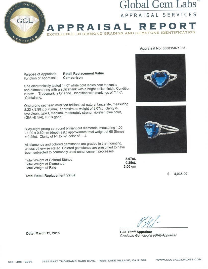 One electronically tested 14KT white gold ladies cast tanzanite and diamond ring with a split shank with a bright polish finish. Trademark is Orianne. Identified with markings of "14K". Condition is new. Containing: One prong set heart modified brilliant cut natural tanzanite, measuring 8.23 x 9.98 x 5.73mm, approximate weight of 3.07ct., clarity is eye clean, type I, medium, moderately strong, violetish blue color, (GIA vB 5/4), cut is good. Sixty-Eight prong set round brilliant cut diamonds, measuring 1.00 - 1.00 x 0.60mm (depth est.) approximate total weight of 68 Stones = 0.25ct. Clarity: I-1 to I-2. Color: I - J. All diamonds and colored gemstones are graded in the mounting, unless otherwise stated. Colored gemstones are presumed to have been subjected to commonly used enhancement processes. Total Weight of Colored Stones 3.07ct. Total Weight of Diamonds 0.25ct. Total Weight of Ring 3.00 grams. GGL Appraised at $4,035.00.