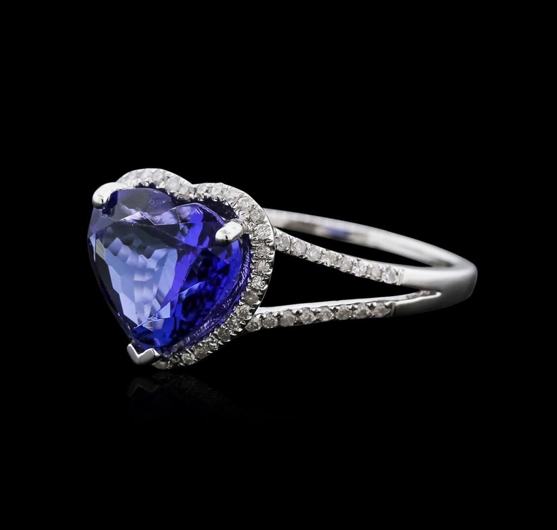 One electronically tested 14KT white gold ladies cast tanzanite and diamond ring with a split shank with a bright polish finish. Trademark is Orianne. Identified with markings of "14K". Condition is new. Containing: One prong set heart modified brilliant cut natural tanzanite, measuring 8.23 x 9.98 x 5.73mm, approximate weight of 3.07ct., clarity is eye clean, type I, medium, moderately strong, violetish blue color, (GIA vB 5/4), cut is good. Sixty-Eight prong set round brilliant cut diamonds, measuring 1.00 - 1.00 x 0.60mm (depth est.) approximate total weight of 68 Stones = 0.25ct. Clarity: I-1 to I-2. Color: I - J. All diamonds and colored gemstones are graded in the mounting, unless otherwise stated. Colored gemstones are presumed to have been subjected to commonly used enhancement processes. Total Weight of Colored Stones 3.07ct. Total Weight of Diamonds 0.25ct. Total Weight of Ring 3.00 grams. GGL Appraised at $4,035.00.