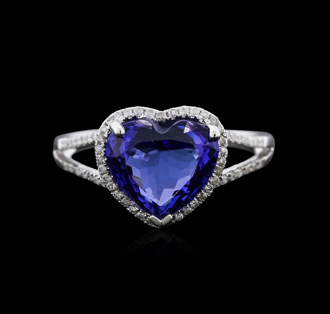 One electronically tested 14KT white gold ladies cast tanzanite and diamond ring with a split shank with a bright polish finish. Trademark is Orianne. Identified with markings of "14K". Condition is new. Containing: One prong set heart modified brilliant cut natural tanzanite, measuring 8.23 x 9.98 x 5.73mm, approximate weight of 3.07ct., clarity is eye clean, type I, medium, moderately strong, violetish blue color, (GIA vB 5/4), cut is good. Sixty-Eight prong set round brilliant cut diamonds, measuring 1.00 - 1.00 x 0.60mm (depth est.) approximate total weight of 68 Stones = 0.25ct. Clarity: I-1 to I-2. Color: I - J. All diamonds and colored gemstones are graded in the mounting, unless otherwise stated. Colored gemstones are presumed to have been subjected to commonly used enhancement processes. Total Weight of Colored Stones 3.07ct. Total Weight of Diamonds 0.25ct. Total Weight of Ring 3.00 grams. GGL Appraised at $4,035.00.