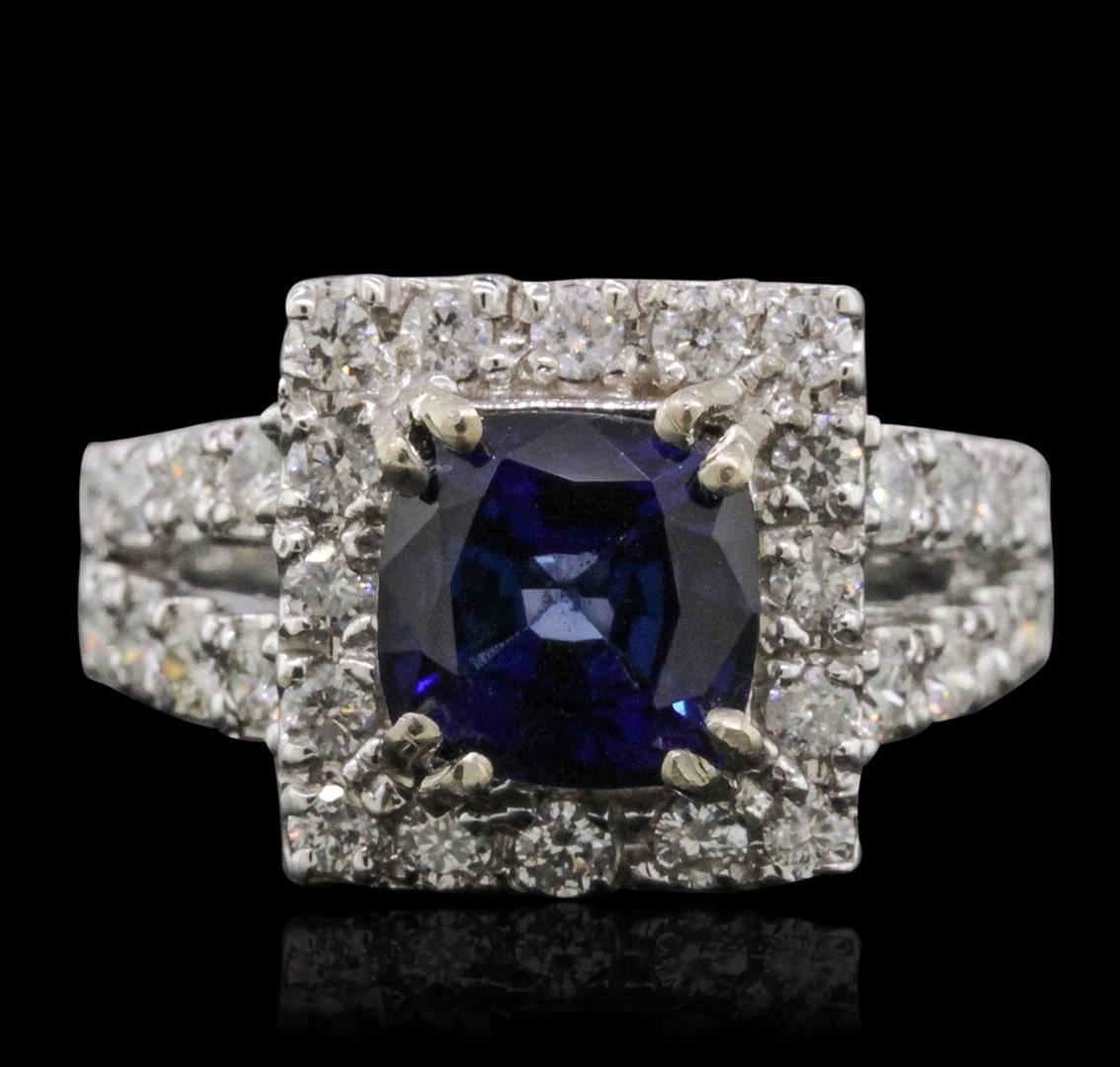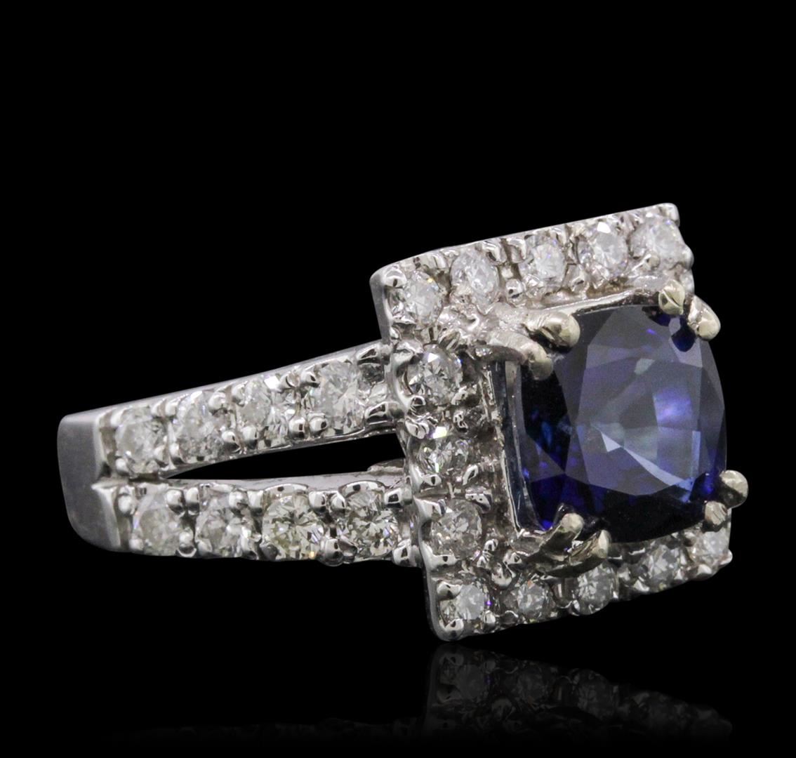 One electronically tested 14KT white gold ladies cast sapphire and diamond ring with a bright polish finish. The featured sapphire is set within a diamond bezel supported by diamond set split shoulders, completed by a two and one-half millimeter wide band. Identified with markings of "K14". Condition is new, good workmanship. Containing: One prong set square cushion brilliant cut natural blue sapphire, measuring 7.85 x 7.75 x 5.08mm, 6% bulge factor, approximate weight of 3.08ct., clarity is eye clean, type II, dark, very slightly grayish, blue color, (GIA B 7/3), cut is good. Transmitting light with no distortion, transparent. Indications of laboratory high temperature diffusion treatment. Graded in the setting. Thirty-Two prong set round brilliant cut diamonds, measuring 2.10 - 2.00 x 1.23mm (depth est.) approximate total weight of 32 Stones = 1.10ct. Graded in the setting. Clarity: SI-2 to I-2. Color: G - I. Total Weight of Colored Stones 3.08ct. Total Weight of Diamonds 1.10ct. Total Weight of Ring 7.33 grams. AIG Appraised at $5,840.00.