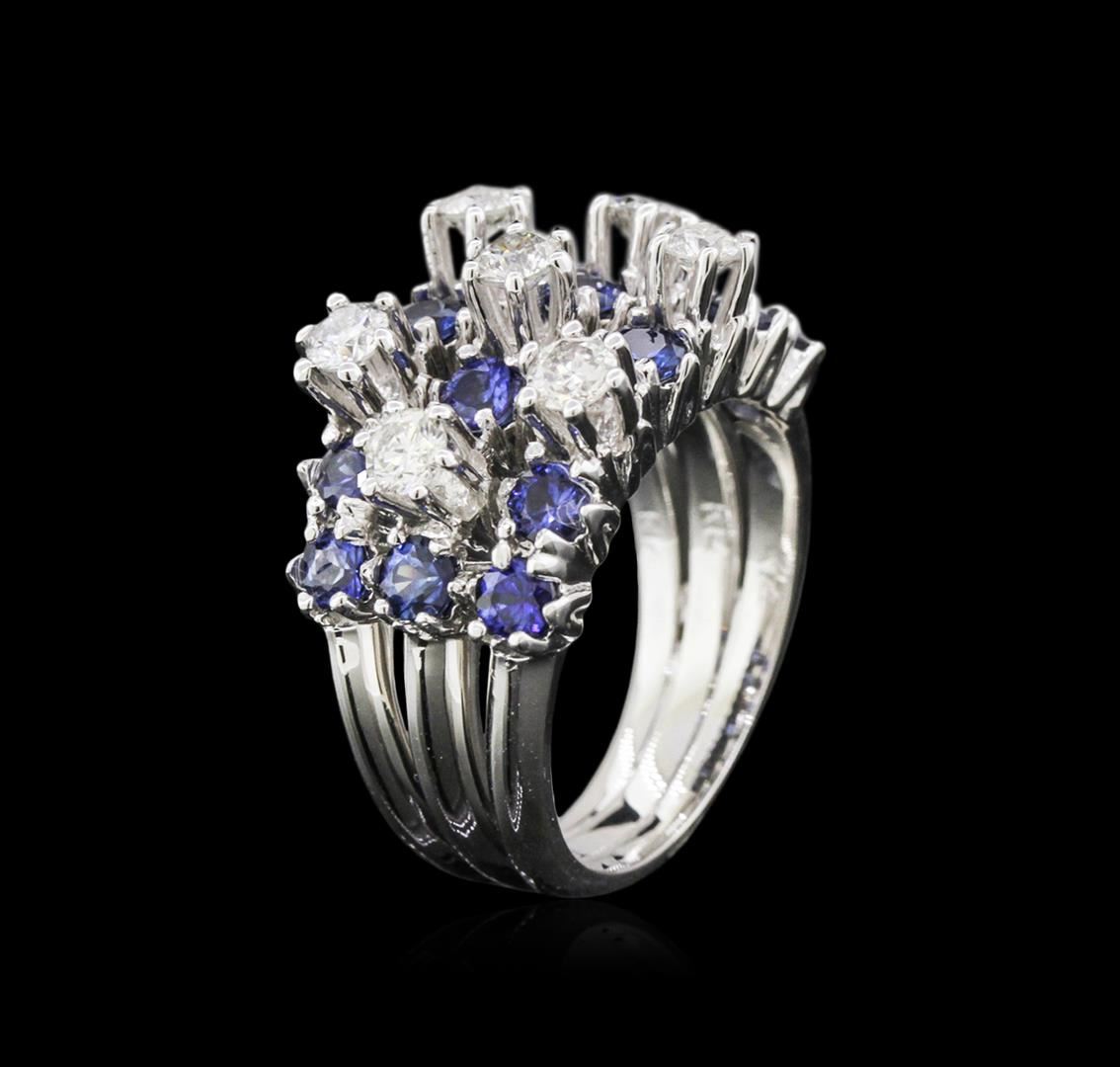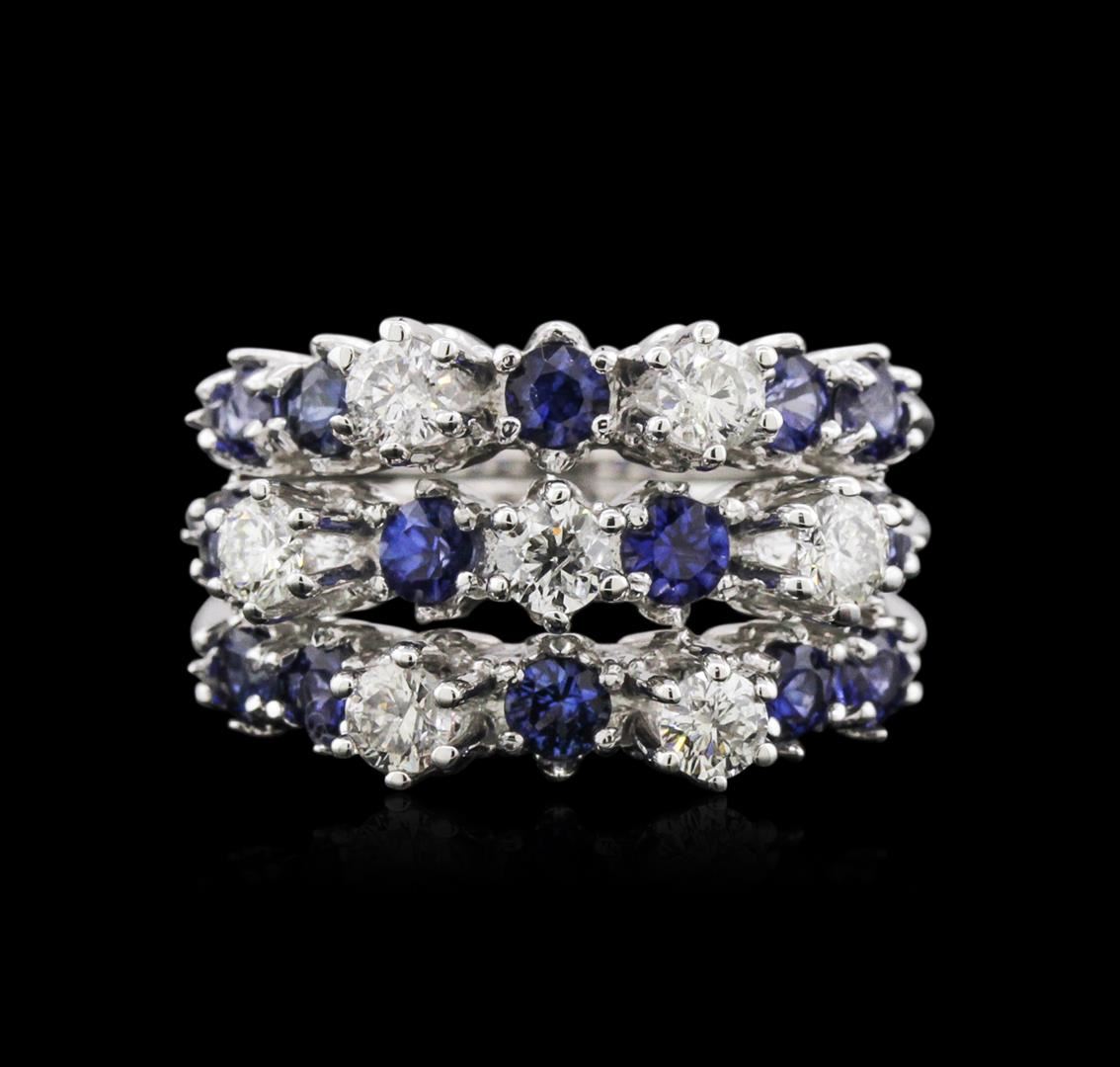 One electronically tested 14KT white gold ladies cast sapphire and diamond ring with a bright polish finish. Identified with markings of "14K". Condition is new. Containing: Fourteen prong set round modified brilliant cut natural blue sapphires, measuring 3.50 - 3.50 x 2.27 mm, approximate total weight of 3.08ct., clarity is eye clean, type II, medium, moderately strong, blue color, (GIA B 5/4), cut is good. Nine prong set round brilliant cut diamonds, measuring 3.10 - 3.10 x 1.86mm (depth est.) approximate total weight of 9 Stones = 0.98ct. Clarity: SI-2 to I-1. Color: J, Cut is Good. Colored gemstones are presumed to have been subjected to commonly used enhancement processes. All diamonds and colored gemstones are graded in the mounting, unless otherwise stated. Total Weight of Colored Stones 3.08ct. Total Weight of Diamonds 0.98ct. Total Weight of Ring 12.00 grams. GGL Appraised at $4,770.00.