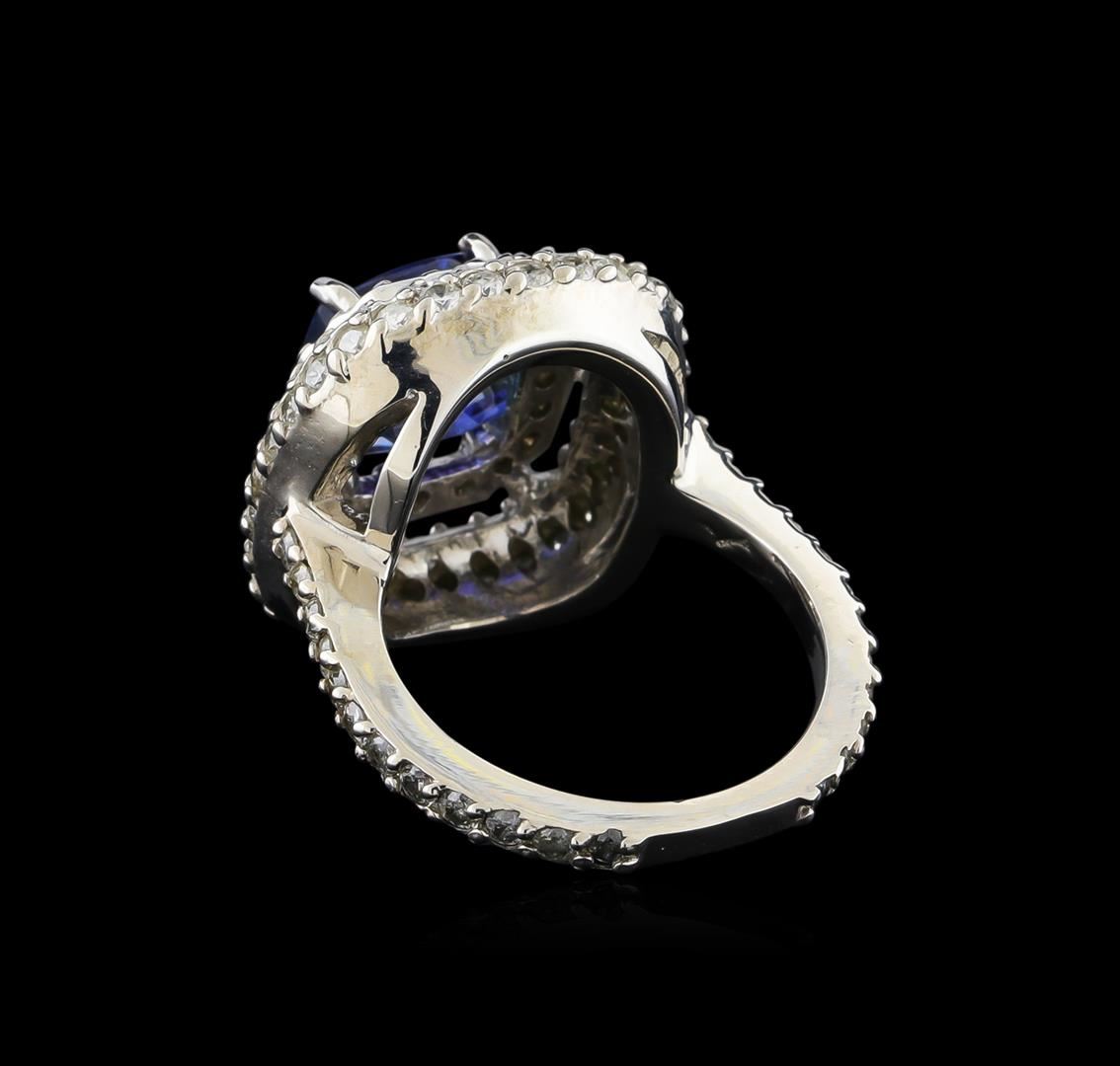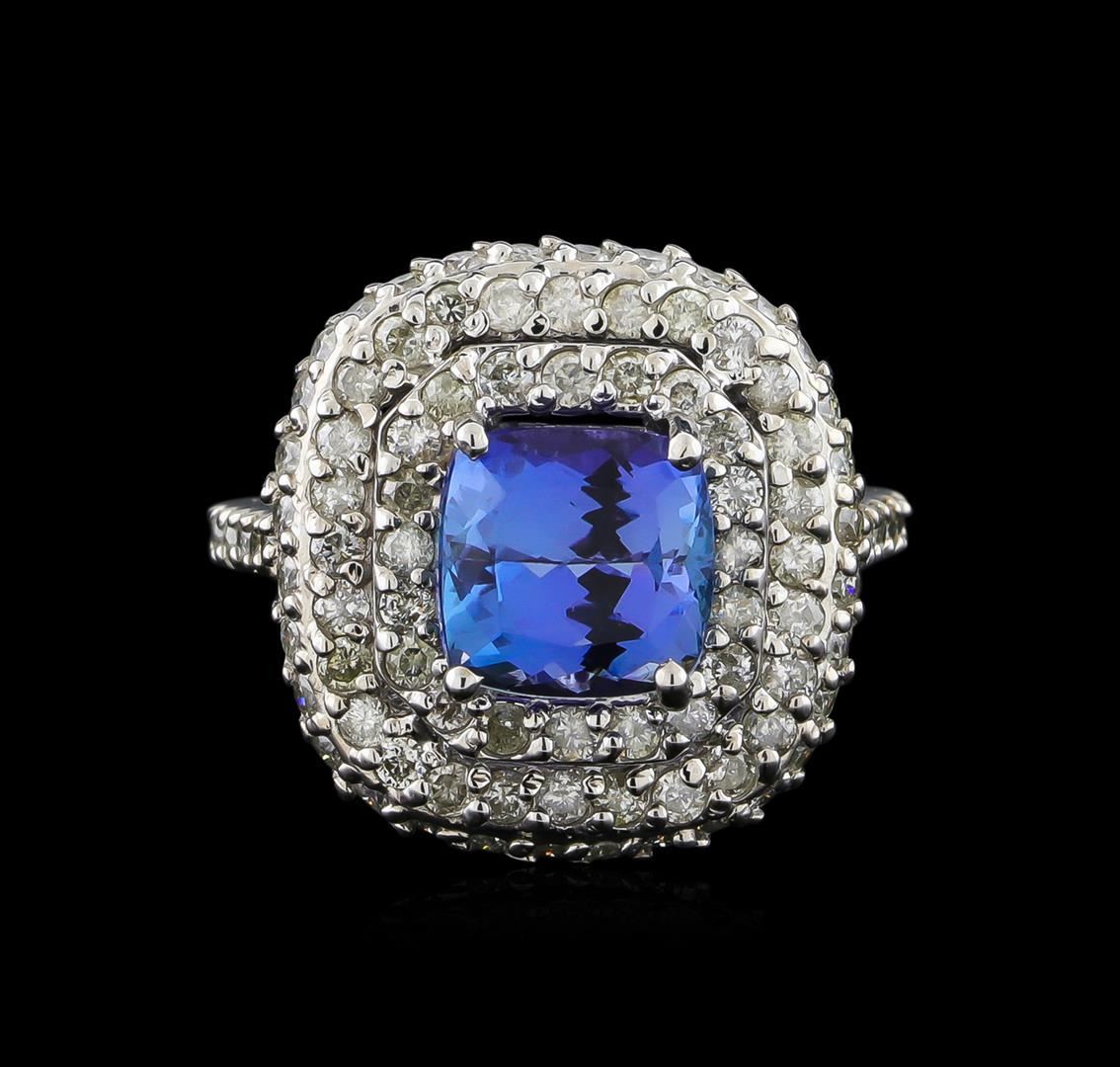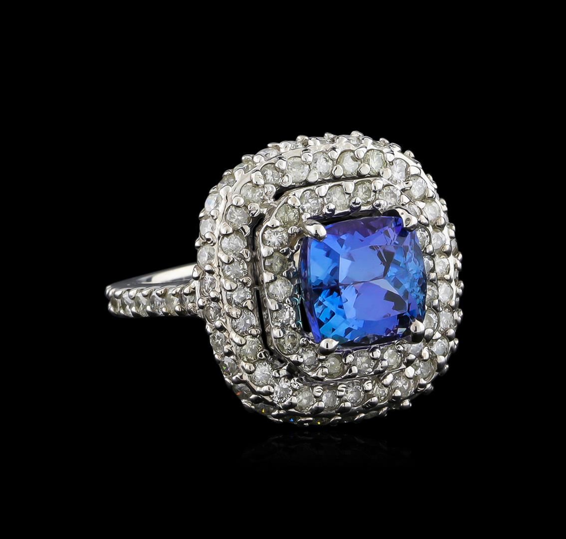 One electronically tested 14KT white gold ladies combination cast & assembled tanzanite and diamond ring with a flat shank with a bright polish finish. Identified with markings of "K14". Condition is new. Containing: One prong set square cushion modified brilliant cut natural tanzanite, measuring 8.51 x 8.37 x 5.49mm, approximate weight of 3.08ct., clarity is eye clean, type I, medium light, moderately strong, violet color, (GIA V 4/4), cut is good. One Hundred Four prong set round brilliant cut diamonds, measuring 1.70 - 1.50 x 0.96mm (depth est.) approximate total weight of 104 Stones = 1.55ct. Clarity: SI-2 to I-1. Color: I - J, Cut is Good. Colored gemstones are presumed to have been subjected to commonly used enhancement processes. All diamonds and colored gemstones are graded in the mounting, unless otherwise stated. Total Weight of Colored Stones 3.08ct. Total Weight of Diamonds 1.55ct. Total Weight of Ring 9.40 grams. GGL Appraised at $10,985.00.