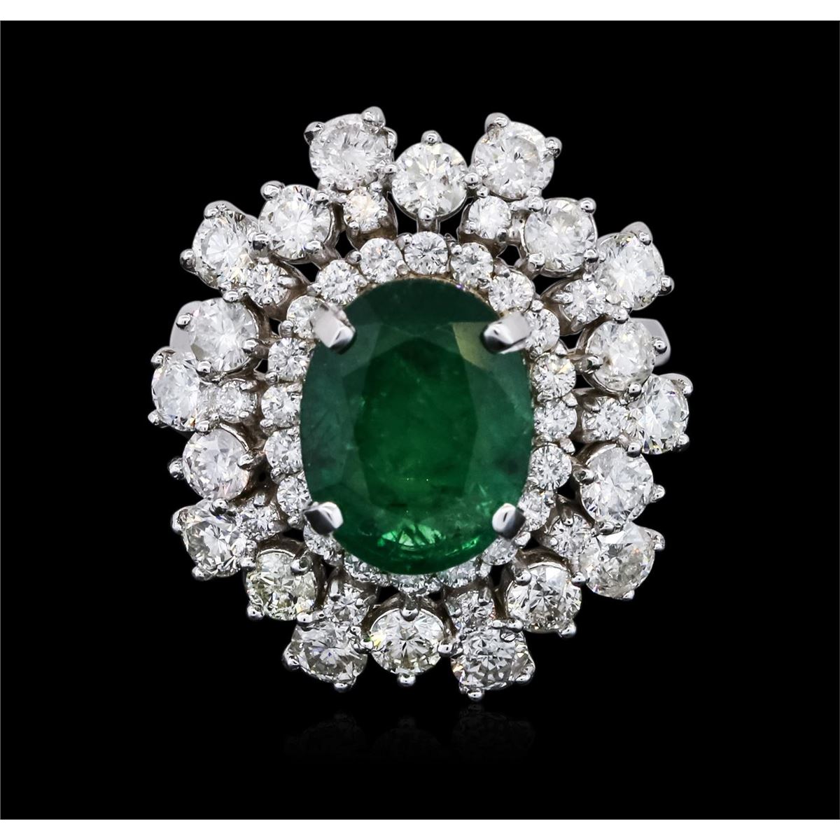 One electronically tested 14KT white gold ladies cast emerald and diamond ring with a bright polish finish. The featured emerald is set within stylized tiered diamond bezels, completed by a four millimeter wide band. Identified with markings of "K14". Condition is new, good workmanship. Containing: One prong set oval mixed cut natural emerald, measuring 11.80 x 9.30 x 4.80mm, 6% bulge factor, approximate weight of 3.08ct., clarity is heavily included, type III, medium dark, moderately strong, very slightly bluish green color, (GIA vslbG 6/4), cut is good. Transmitting light somewhat diffusely, transparent to translucent. Naturally occurring internal & external characteristics are present. Indications of oil residue. Graded in the setting. Twenty-Two prong set round brilliant cut diamonds, measuring 3.20 - 3.00 x 1.86mm (depth est.) approximate total weight of 22 Stones = 2.50ct. Graded in the setting. Clarity: SI-1 to I-1. Color: G - I Thirty prong set round brilliant cut diamonds, measuring 1.90 - 1.80 x 1.11mm (depth est.) approximate total weight of 30 Stones = 0.79ct. Graded in the setting. Clarity: SI-1 to I-1. Color: G - I. Total Weight of Colored Stones 3.08ct. Total Weight of Diamonds 3.29ct. Total Weight of Ring 11.87 grams. AIG Appraised at $15,665.00.