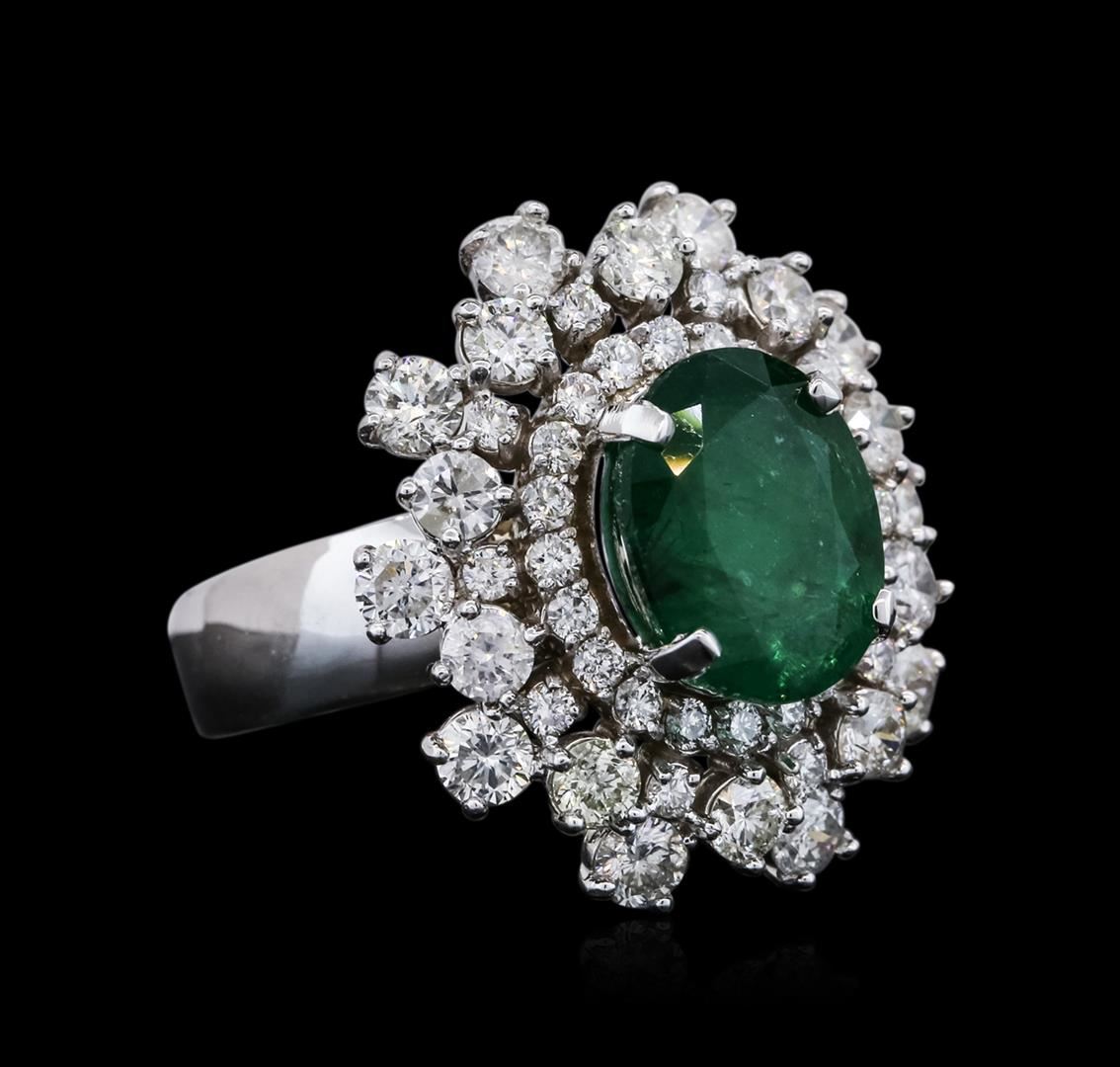 One electronically tested 14KT white gold ladies cast emerald and diamond ring with a bright polish finish. The featured emerald is set within stylized tiered diamond bezels, completed by a four millimeter wide band. Identified with markings of "K14". Condition is new, good workmanship. Containing: One prong set oval mixed cut natural emerald, measuring 11.80 x 9.30 x 4.80mm, 6% bulge factor, approximate weight of 3.08ct., clarity is heavily included, type III, medium dark, moderately strong, very slightly bluish green color, (GIA vslbG 6/4), cut is good. Transmitting light somewhat diffusely, transparent to translucent. Naturally occurring internal & external characteristics are present. Indications of oil residue. Graded in the setting. Twenty-Two prong set round brilliant cut diamonds, measuring 3.20 - 3.00 x 1.86mm (depth est.) approximate total weight of 22 Stones = 2.50ct. Graded in the setting. Clarity: SI-1 to I-1. Color: G - I Thirty prong set round brilliant cut diamonds, measuring 1.90 - 1.80 x 1.11mm (depth est.) approximate total weight of 30 Stones = 0.79ct. Graded in the setting. Clarity: SI-1 to I-1. Color: G - I. Total Weight of Colored Stones 3.08ct. Total Weight of Diamonds 3.29ct. Total Weight of Ring 11.87 grams. AIG Appraised at $15,665.00.