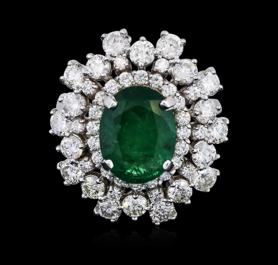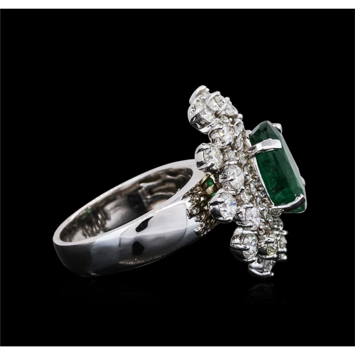 One electronically tested 14KT white gold ladies cast emerald and diamond ring with a bright polish finish. The featured emerald is set within stylized tiered diamond bezels, completed by a four millimeter wide band. Identified with markings of "K14". Condition is new, good workmanship. Containing: One prong set oval mixed cut natural emerald, measuring 11.80 x 9.30 x 4.80mm, 6% bulge factor, approximate weight of 3.08ct., clarity is heavily included, type III, medium dark, moderately strong, very slightly bluish green color, (GIA vslbG 6/4), cut is good. Transmitting light somewhat diffusely, transparent to translucent. Naturally occurring internal & external characteristics are present. Indications of oil residue. Graded in the setting. Twenty-Two prong set round brilliant cut diamonds, measuring 3.20 - 3.00 x 1.86mm (depth est.) approximate total weight of 22 Stones = 2.50ct. Graded in the setting. Clarity: SI-1 to I-1. Color: G - I Thirty prong set round brilliant cut diamonds, measuring 1.90 - 1.80 x 1.11mm (depth est.) approximate total weight of 30 Stones = 0.79ct. Graded in the setting. Clarity: SI-1 to I-1. Color: G - I. Total Weight of Colored Stones 3.08ct. Total Weight of Diamonds 3.29ct. Total Weight of Ring 11.87 grams. AIG Appraised at $15,665.00.