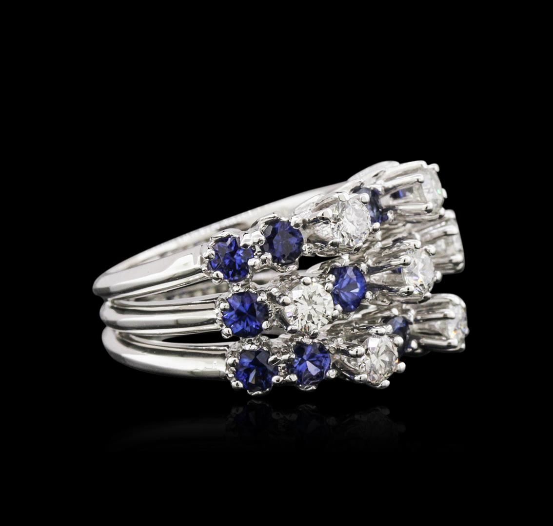 One electronically tested 14KT white gold ladies cast sapphire and diamond ring with a bright polish finish. Identified with markings of "14K". Condition is new. Containing: Fourteen prong set round modified brilliant cut natural blue sapphires, measuring 3.50 - 3.50 x 2.27 mm, approximate total weight of 3.08ct., clarity is eye clean, type II, medium, moderately strong, blue color, (GIA B 5/4), cut is good. Nine prong set round brilliant cut diamonds, measuring 3.10 - 3.10 x 1.86mm (depth est.) approximate total weight of 9 Stones = 0.98ct. Clarity: SI-2 to I-1. Color: J, Cut is Good. Colored gemstones are presumed to have been subjected to commonly used enhancement processes. All diamonds and colored gemstones are graded in the mounting, unless otherwise stated. Total Weight of Colored Stones 3.08ct. Total Weight of Diamonds 0.98ct. Total Weight of Ring 12.00 grams. GGL Appraised at $4,770.00.