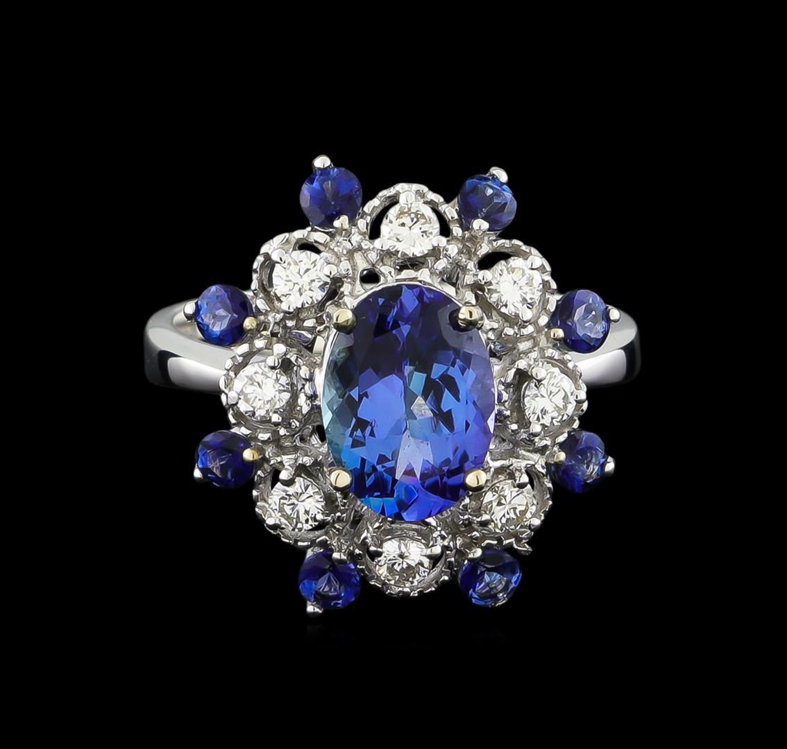 One electronically tested 14KT white gold ladies combination cast & assembled tanzanite and diamond ring with a flat shank with a bright polish finish. Identified with markings of "14K". Condition is new. Containing: One prong set oval modified brilliant cut natural tanzanite, measuring 9.36 x 6.88 x 4.47mm, approximate weight of 1.97ct., clarity is eye clean, type I, medium light, very slightly grayish, violet color, (GIA V 4/3), cut is good. Eight prong set radiant modified brilliant cut natural tanzanites, measuring 2.90 x 2.90 x 1.89mm, approximate total weight of 1.12ct., clarity is eye clean, type I, medium light, very slightly grayish, violet color, (GIA V 4/3), cut is good. Eight prong set round brilliant cut diamonds, measuring 2.20 - 2.20 x 1.32mm (depth est.) approximate total weight of 8 Stones = 0.31ct. Clarity: SI-1. Color: J, Cut is Good. Colored gemstones are presumed to have been subjected to commonly used enhancement processes. All diamonds and colored gemstones are graded in the mounting, unless otherwise stated. Total Weight of Colored Stones 3.09ct. Total Weight of Diamonds 0.31ct. Total Weight of Ring 4.90 grams. GGL Appraised at $6,515.00.