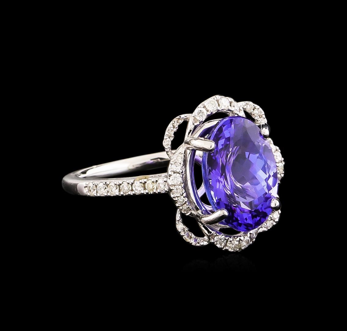One electronically tested 14KT white gold ladies combination cast & assembled ring with a bright polish finish. Condition is new. Identified with markings of "14K". Containing: One prong set oval modified brilliant cut natural tanzanite, measuring 11.40 x 8.00 x 4.90mm, approximate weight of 3.09ct., clarity is eye clean, type I, medium, very slightly grayish, bluish violet color, (GIA bV 5/3), cut is good. Forty-Six prong set round brilliant cut diamonds, measuring 1.30 - 1.10 x 0.72mm (depth est.) approximate total weight of 46 Stones = 0.29ct. Clarity: I-1 to I-2. Color: H - I, Cut is Good. Colored gemstones are presumed to have been subjected to commonly used enhancement processes. All diamonds and colored gemstones are graded in the mounting, unless otherwise stated. Total Weight of Colored Stones 3.09ct. Total Weight of Diamonds 0.29ct. Total Weight of Ring 4.20 grams. GGL Appraised at $6,020.00.