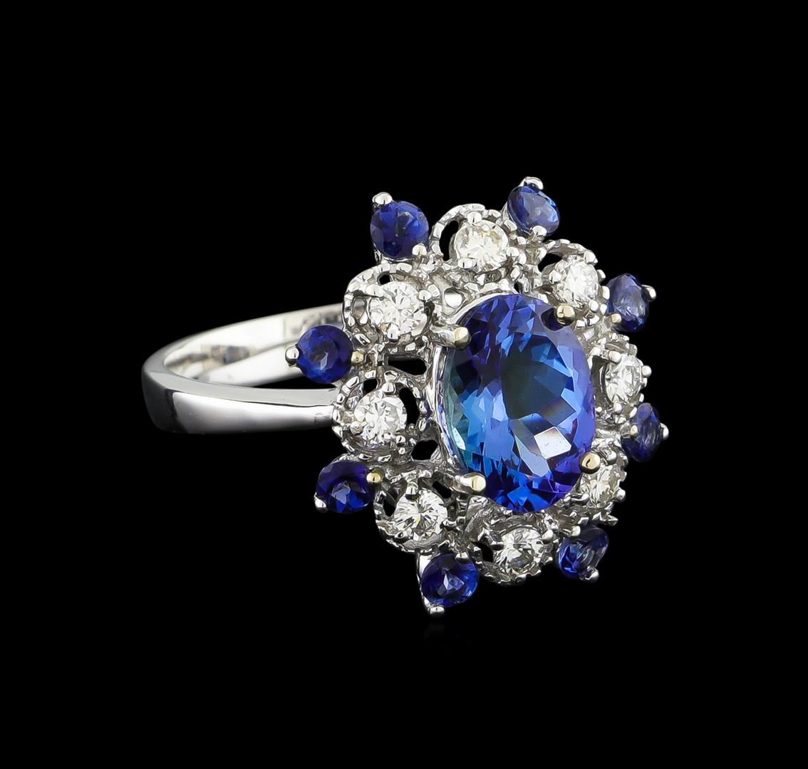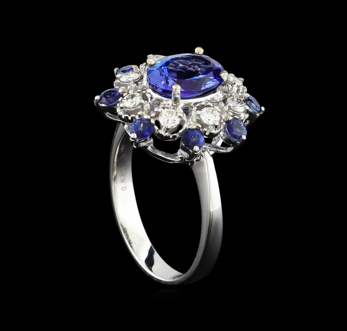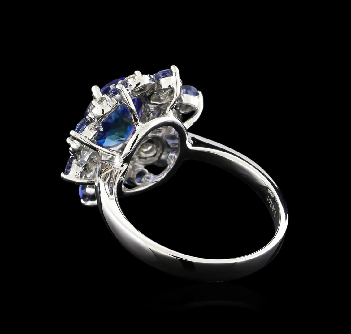 One electronically tested 14KT white gold ladies combination cast & assembled tanzanite and diamond ring with a flat shank with a bright polish finish. Identified with markings of "14K". Condition is new. Containing: One prong set oval modified brilliant cut natural tanzanite, measuring 9.36 x 6.88 x 4.47mm, approximate weight of 1.97ct., clarity is eye clean, type I, medium light, very slightly grayish, violet color, (GIA V 4/3), cut is good. Eight prong set radiant modified brilliant cut natural tanzanites, measuring 2.90 x 2.90 x 1.89mm, approximate total weight of 1.12ct., clarity is eye clean, type I, medium light, very slightly grayish, violet color, (GIA V 4/3), cut is good. Eight prong set round brilliant cut diamonds, measuring 2.20 - 2.20 x 1.32mm (depth est.) approximate total weight of 8 Stones = 0.31ct. Clarity: SI-1. Color: J, Cut is Good. Colored gemstones are presumed to have been subjected to commonly used enhancement processes. All diamonds and colored gemstones are graded in the mounting, unless otherwise stated. Total Weight of Colored Stones 3.09ct. Total Weight of Diamonds 0.31ct. Total Weight of Ring 4.90 grams. GGL Appraised at $6,515.00.