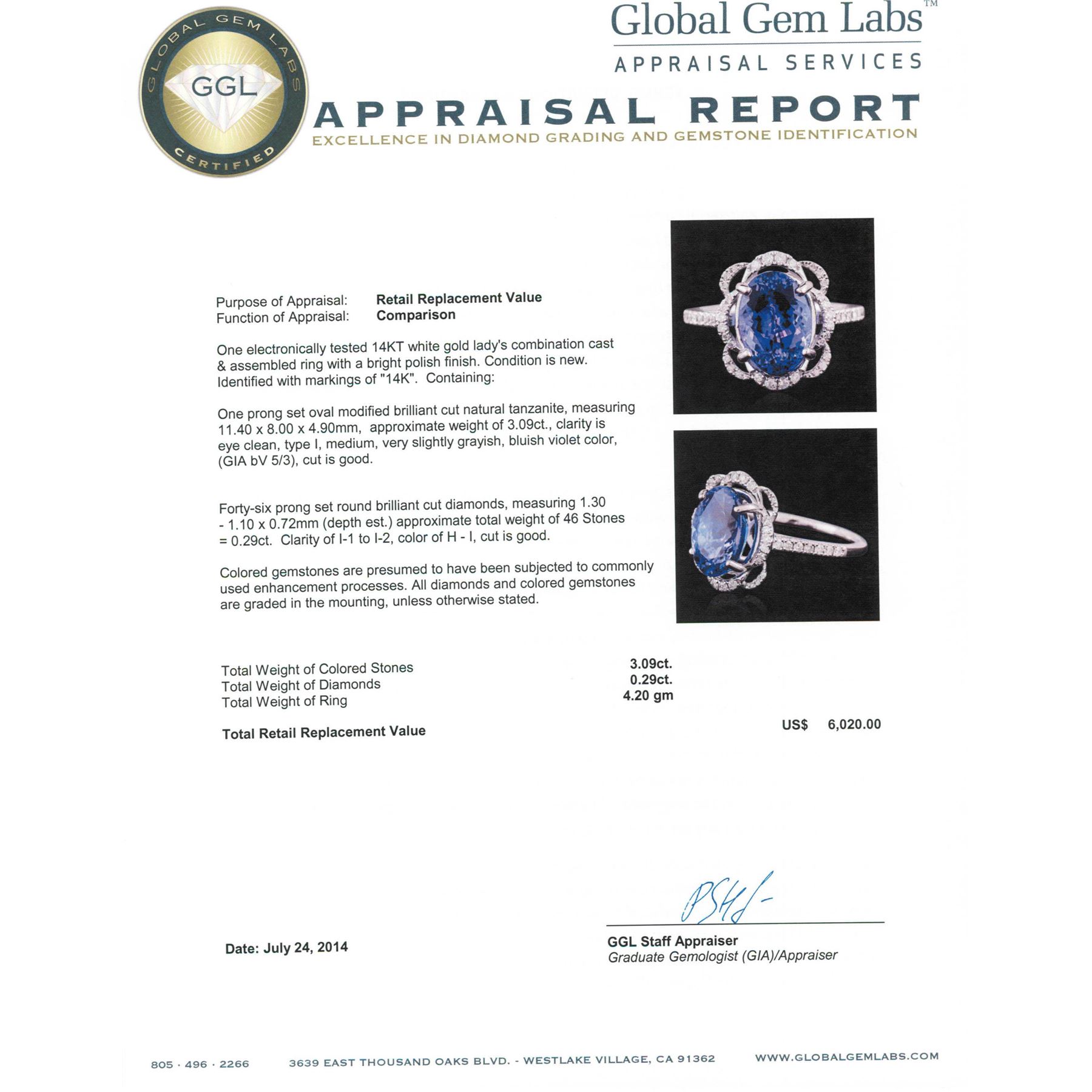 One electronically tested 14KT white gold ladies combination cast & assembled ring with a bright polish finish. Condition is new. Identified with markings of "14K". Containing: One prong set oval modified brilliant cut natural tanzanite, measuring 11.40 x 8.00 x 4.90mm, approximate weight of 3.09ct., clarity is eye clean, type I, medium, very slightly grayish, bluish violet color, (GIA bV 5/3), cut is good. Forty-Six prong set round brilliant cut diamonds, measuring 1.30 - 1.10 x 0.72mm (depth est.) approximate total weight of 46 Stones = 0.29ct. Clarity: I-1 to I-2. Color: H - I, Cut is Good. Colored gemstones are presumed to have been subjected to commonly used enhancement processes. All diamonds and colored gemstones are graded in the mounting, unless otherwise stated. Total Weight of Colored Stones 3.09ct. Total Weight of Diamonds 0.29ct. Total Weight of Ring 4.20 grams. GGL Appraised.