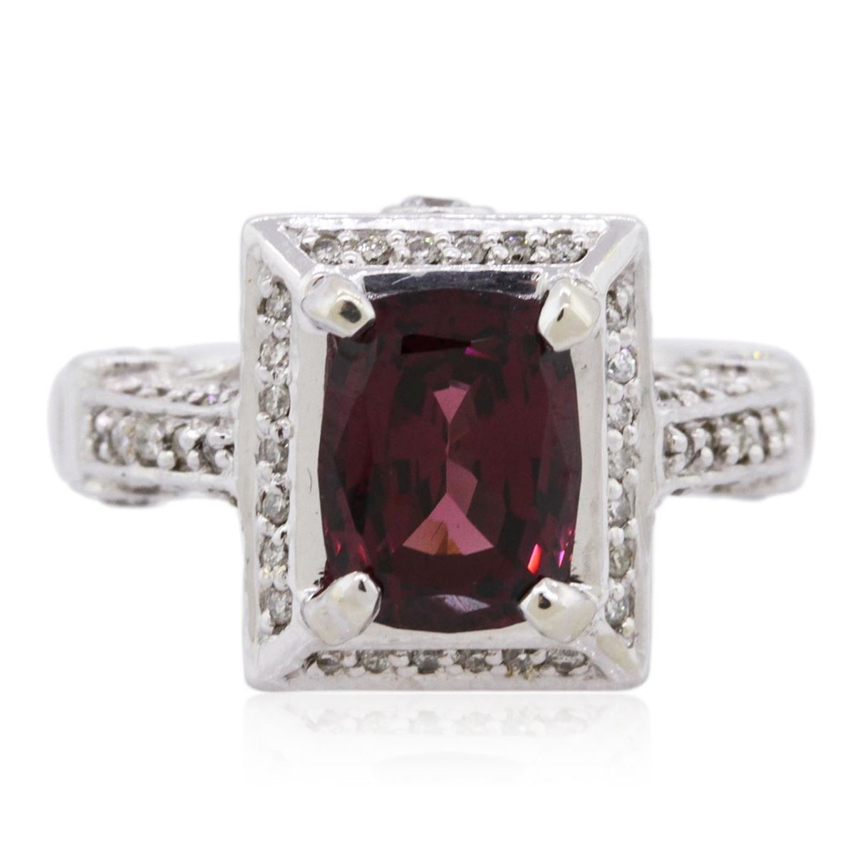 One electronically tested 14KT white gold ladies cast rhodolite garnet and diamond ring with a bright polish finish. The featured rhodolite garnet is set within a diamond bezel supported by a diamond set under gallery and diamond set shoulders, completed by a three millimeter wide band. Identified with markings of "14K". Condition is new, good workmanship. Containing: One prong set rectangular cushion mixed cut natural rhodolite garnet, measuring 9.10 x 6.90 x 5.20mm, 6%. bulge factor, approximate weight of 3.09ct., clarity is eye clean, type II, dark, very slightly brownish, strongly purplish red color, (GIA stpR 7/3), cut is good. Transmitting light with no distortion, transparent. Refractive index testing results of 1.76. This is a conclusive result for pyrope-almandite garnet(rhodolite). Graded in the setting. Six bezel set round brilliant cut diamonds, measuring 2.40 - 2.40 x 1.44mm (depth est.) approximate total weight of 6 Stones = 0.35ct. Graded in the setting. Clarity: SI-1 to SI-2. Color: G - I Ninety-Six prong set round brilliant cut diamonds, measuring 1.10 - 1.00 x 0.63mm (depth est.) approximate total weight of 96 Stones = 0.50ct. Graded in the setting. Clarity: SI-1 to I-1. Color: G - I. Total Weight of Colored Stones 3.09ct. Total Weight of Diamonds 0.85ct. Total Weight of Ring 11.68 grams. AIG Appraised at $5,555.00.