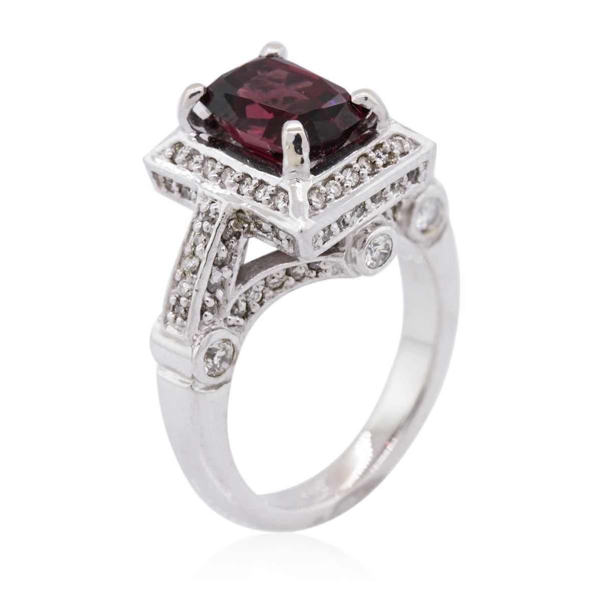One electronically tested 14KT white gold ladies cast rhodolite garnet and diamond ring with a bright polish finish. The featured rhodolite garnet is set within a diamond bezel supported by a diamond set under gallery and diamond set shoulders, completed by a three millimeter wide band. Identified with markings of "14K". Condition is new, good workmanship. Containing: One prong set rectangular cushion mixed cut natural rhodolite garnet, measuring 9.10 x 6.90 x 5.20mm, 6%. bulge factor, approximate weight of 3.09ct., clarity is eye clean, type II, dark, very slightly brownish, strongly purplish red color, (GIA stpR 7/3), cut is good. Transmitting light with no distortion, transparent. Refractive index testing results of 1.76. This is a conclusive result for pyrope-almandite garnet(rhodolite). Graded in the setting. Six bezel set round brilliant cut diamonds, measuring 2.40 - 2.40 x 1.44mm (depth est.) approximate total weight of 6 Stones = 0.35ct. Graded in the setting. Clarity: SI-1 to SI-2. Color: G - I Ninety-Six prong set round brilliant cut diamonds, measuring 1.10 - 1.00 x 0.63mm (depth est.) approximate total weight of 96 Stones = 0.50ct. Graded in the setting. Clarity: SI-1 to I-1. Color: G - I. Total Weight of Colored Stones 3.09ct. Total Weight of Diamonds 0.85ct. Total Weight of Ring 11.68 grams. AIG Appraised at $5,555.00.