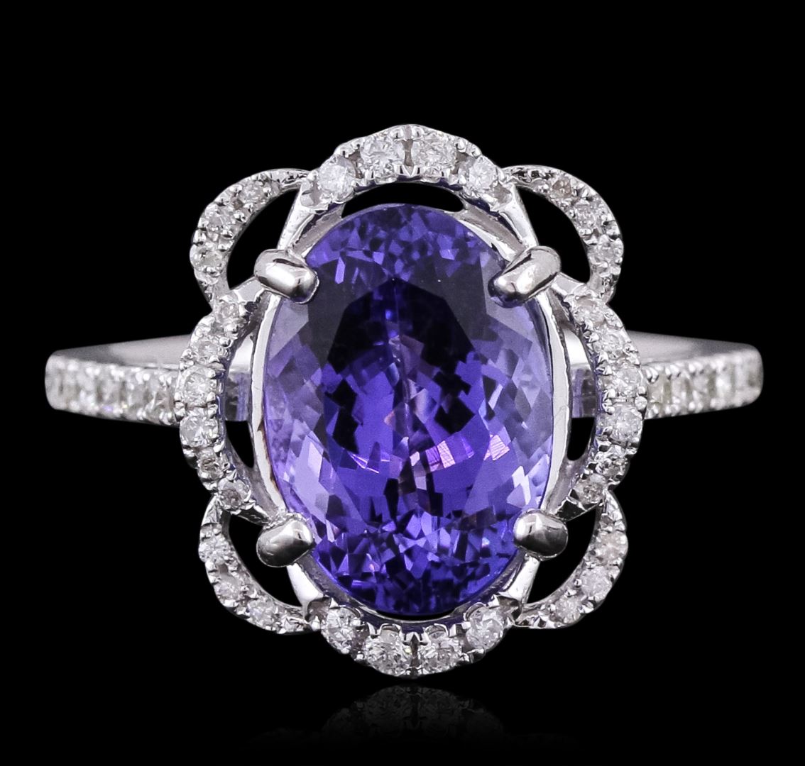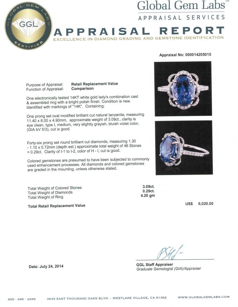 One electronically tested 14KT white gold ladies combination cast & assembled ring with a bright polish finish. Condition is new. Identified with markings of "14K". Containing: One prong set oval modified brilliant cut natural tanzanite, measuring 11.40 x 8.00 x 4.90mm, approximate weight of 3.09ct., clarity is eye clean, type I, medium, very slightly grayish, bluish violet color, (GIA bV 5/3), cut is good. Forty-Six prong set round brilliant cut diamonds, measuring 1.30 - 1.10 x 0.72mm (depth est.) approximate total weight of 46 Stones = 0.29ct. Clarity: I-1 to I-2. Color: H - I, Cut is Good. Colored gemstones are presumed to have been subjected to commonly used enhancement processes. All diamonds and colored gemstones are graded in the mounting, unless otherwise stated. Total Weight of Colored Stones 3.09ct. Total Weight of Diamonds 0.29ct. Total Weight of Ring 4.20 grams. GGL Appraised at $6,020.00.