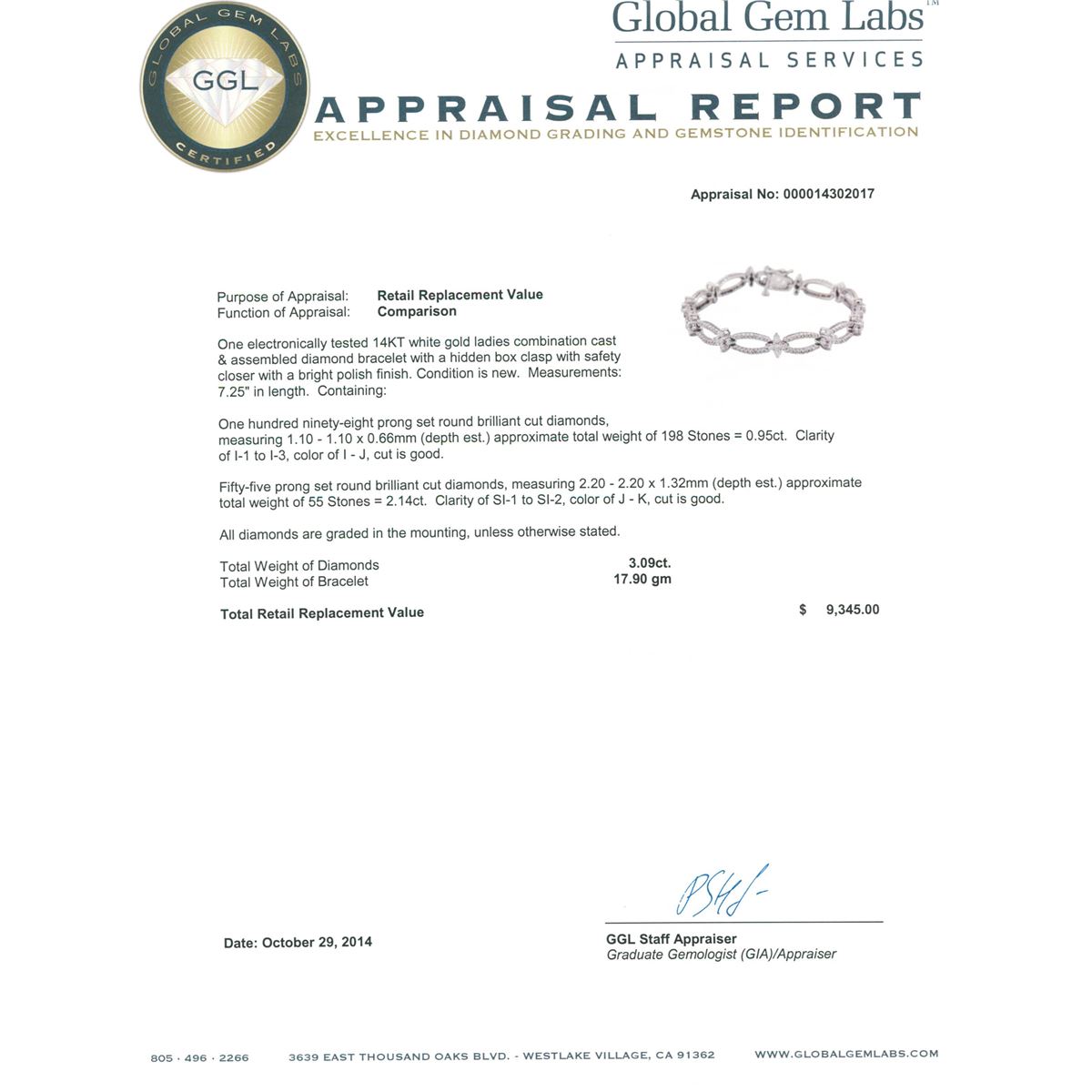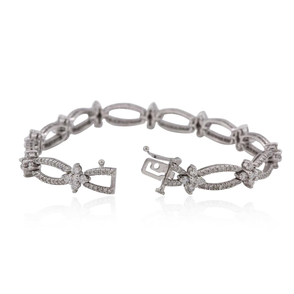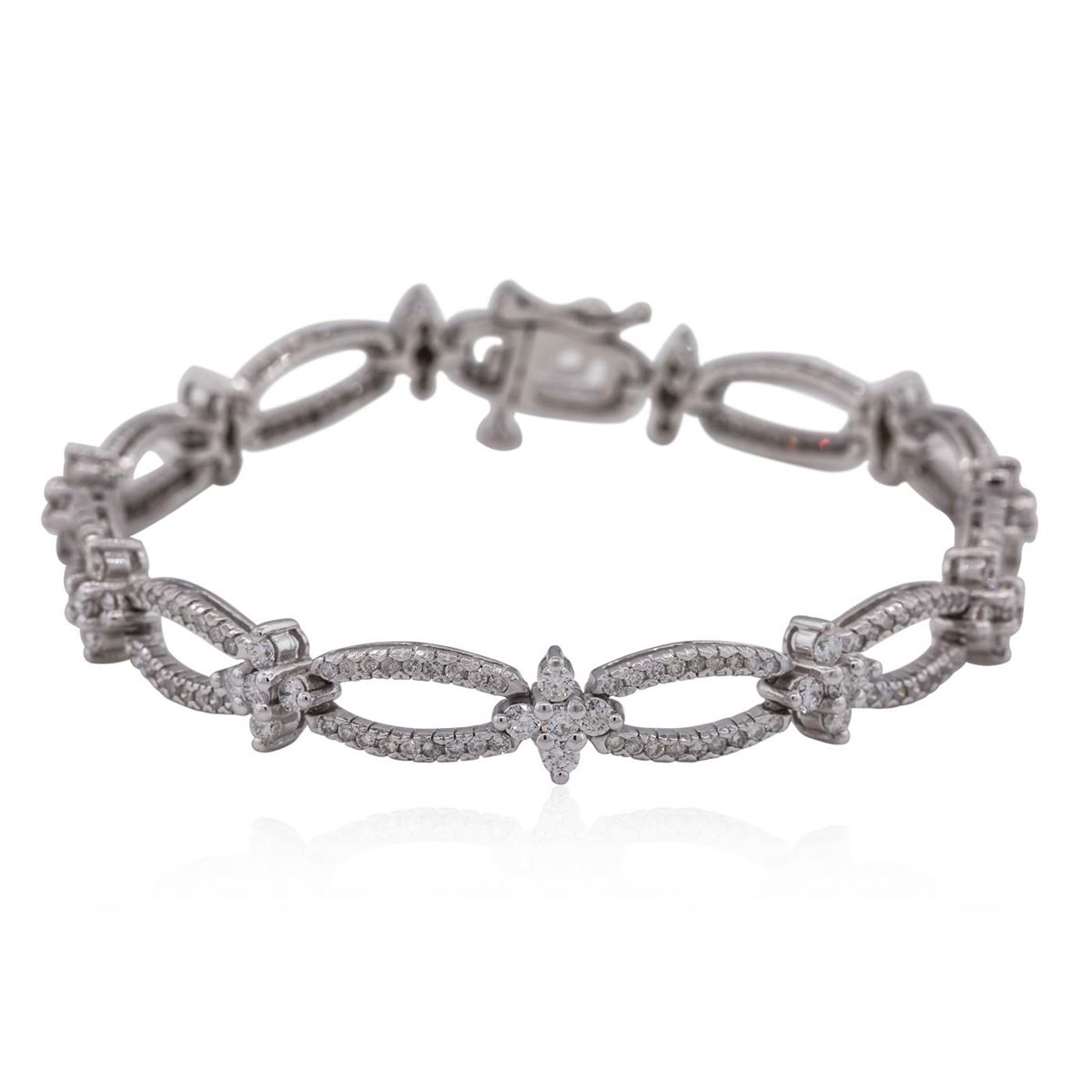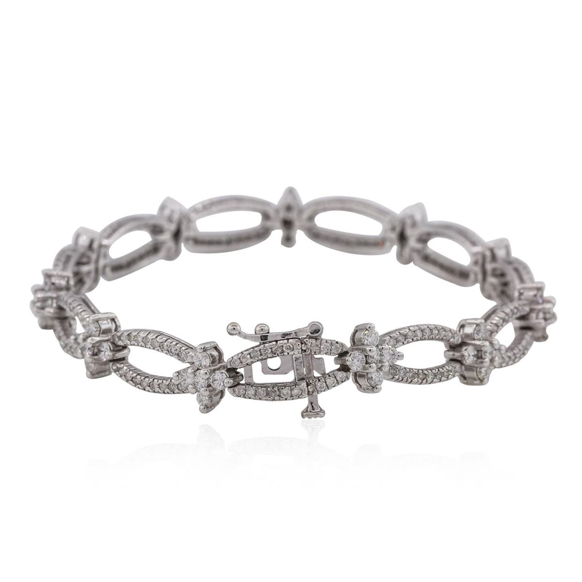 One electronically tested 14KT white gold ladies combination cast & assembled diamond bracelet with a hidden box clasp with safety closer with a bright polish finish. Measurements: 7.25 in length. Condition is new. Containing: One Hundred Ninety-Eight prong set round brilliant cut diamonds, measuring 1.10 - 1.10 x 0.66mm (depth est.) approximate total weight of 198 Stones = 0.95ct. Clarity: I-1 to I-3. Color: I - J, Cut is Good. Fifty-Five prong set round brilliant cut diamonds, measuring 2.20 - 2.20 x 1.32mm (depth est.) approximate total weight of 55 Stones = 2.14ct. Clarity: SI-1 to SI-2. Color: J - K, Cut is Good. All diamonds are graded in the mounting, unless otherwise stated. Total Weight of Diamonds 3.09ct. Total Weight of Bracelet 17.90 grams. GGL Appraised at $9,345.00.