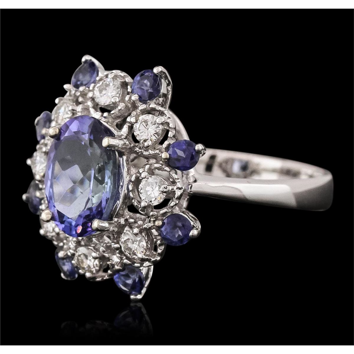One electronically tested 14KT white gold ladies combination cast & assembled tanzanite and diamond ring with a flat shank with a bright polish finish. Identified with markings of "14K". Condition is new. Containing: One prong set oval modified brilliant cut natural tanzanite, measuring 9.36 x 6.88 x 4.47mm, approximate weight of 1.97ct., clarity is eye clean, type I, medium light, very slightly grayish, violet color, (GIA V 4/3), cut is good. Eight prong set radiant modified brilliant cut natural tanzanites, measuring 2.90 x 2.90 x 1.89mm, approximate total weight of 1.12ct., clarity is eye clean, type I, medium light, very slightly grayish, violet color, (GIA V 4/3), cut is good. Eight prong set round brilliant cut diamonds, measuring 2.20 - 2.20 x 1.32mm (depth est.) approximate total weight of 8 Stones = 0.31ct. Clarity: SI-1. Color: J, Cut is Good. Colored gemstones are presumed to have been subjected to commonly used enhancement processes. All diamonds and colored gemstones are graded in the mounting, unless otherwise stated. Total Weight of Colored Stones 3.09ct. Total Weight of Diamonds 0.31ct. Total Weight of Ring 4.90 grams. GGL Appraised at $6,515.00.
