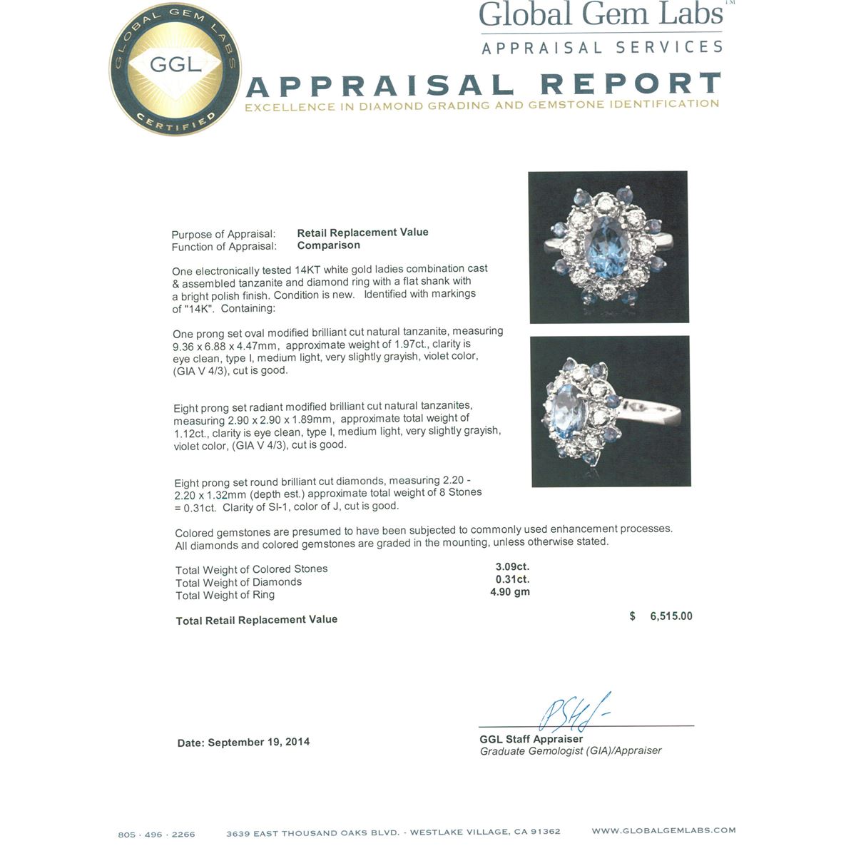 One electronically tested 14KT white gold ladies combination cast & assembled tanzanite and diamond ring with a flat shank with a bright polish finish. Identified with markings of "14K". Condition is new. Containing: One prong set oval modified brilliant cut natural tanzanite, measuring 9.36 x 6.88 x 4.47mm, approximate weight of 1.97ct., clarity is eye clean, type I, medium light, very slightly grayish, violet color, (GIA V 4/3), cut is good. Eight prong set radiant modified brilliant cut natural tanzanites, measuring 2.90 x 2.90 x 1.89mm, approximate total weight of 1.12ct., clarity is eye clean, type I, medium light, very slightly grayish, violet color, (GIA V 4/3), cut is good. Eight prong set round brilliant cut diamonds, measuring 2.20 - 2.20 x 1.32mm (depth est.) approximate total weight of 8 Stones = 0.31ct. Clarity: SI-1. Color: J, Cut is Good. Colored gemstones are presumed to have been subjected to commonly used enhancement processes. All diamonds and colored gemstones are graded in the mounting, unless otherwise stated. Total Weight of Colored Stones 3.09ct. Total Weight of Diamonds 0.31ct. Total Weight of Ring 4.90 grams. GGL Appraised at $6,515.00.