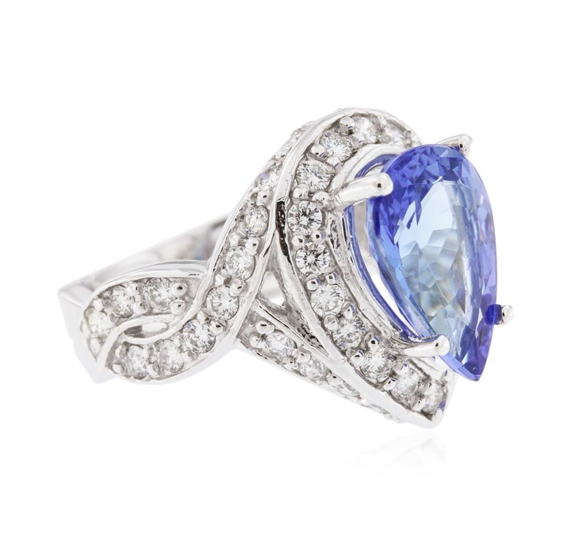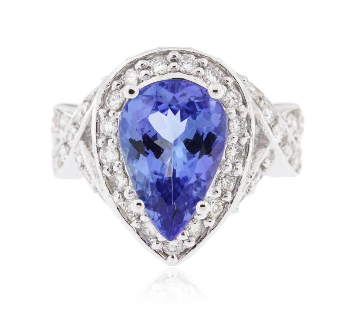 One electronically tested 14KT white gold ladies cast tanzanite and diamond ring with a bright polish finish. Identified with markings of "K14". Condition is new. Containing: One prong set oval modified brilliant cut natural tanzanite, measuring 10.10 x 7.80 x 5.60mm, approximate weight of 3.10ct., clarity is eye clean, type I, medium light, very slightly grayish, violet color, (GIA V 4/3), cut is good. Fifty-Three prong set round brilliant cut diamonds, measuring 1.50 - 1.50 x 0.90mm (depth est.) approximate total weight of 53 Stones = 0.65ct. Clarity: SI-2 to I-1. Color: I - J, Cut is Good. Colored gemstones are presumed to have been subjected to commonly used enhancement processes. All diamonds and colored gemstones are graded in the mounting, unless otherwise stated. Total Weight of Colored Stones 3.10ct. Total Weight of Diamonds 0.65ct. Total Weight of Ring 9.20 grams. GGL Appraised at $5,940.00.