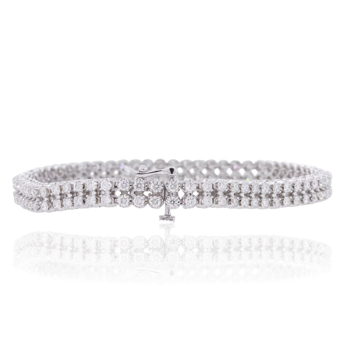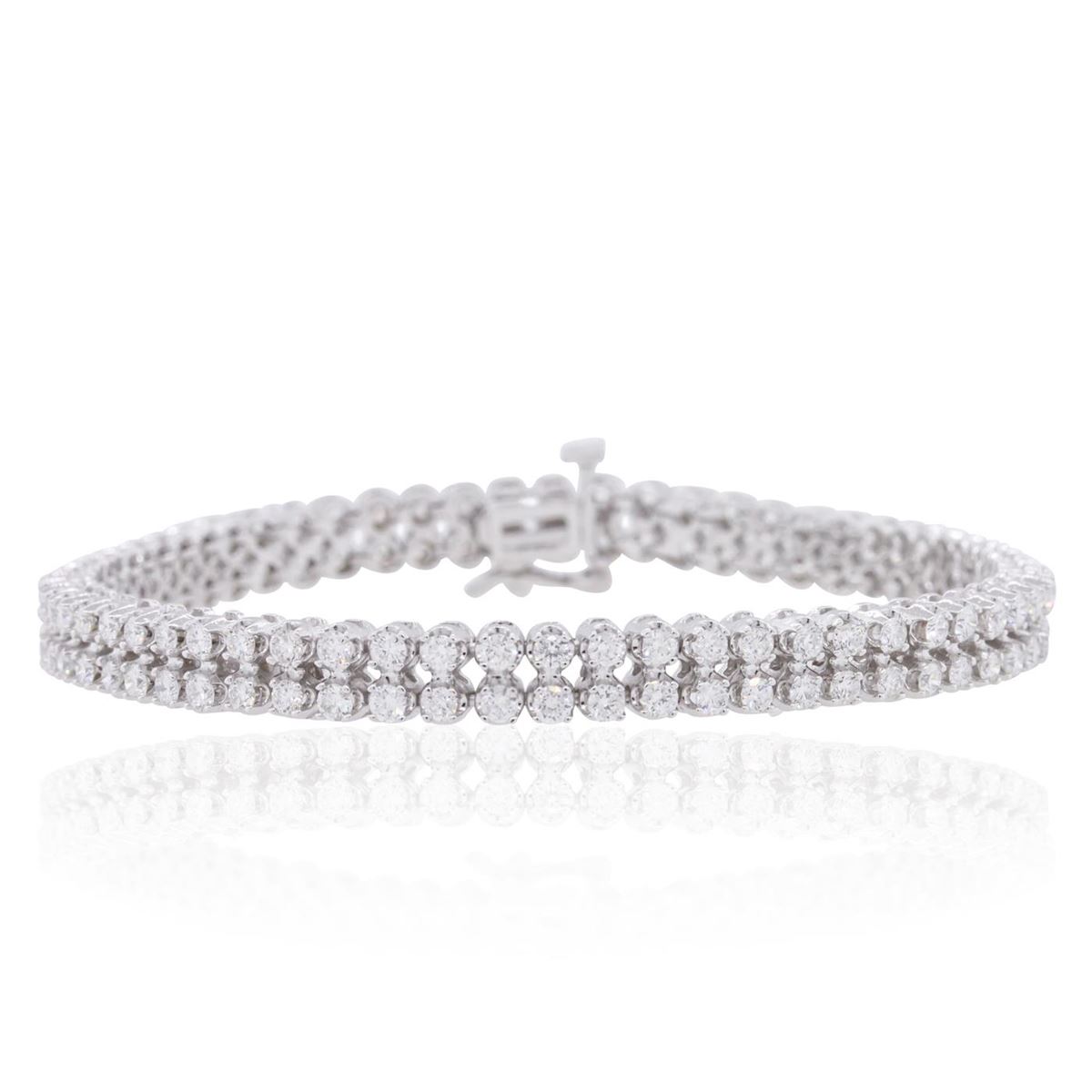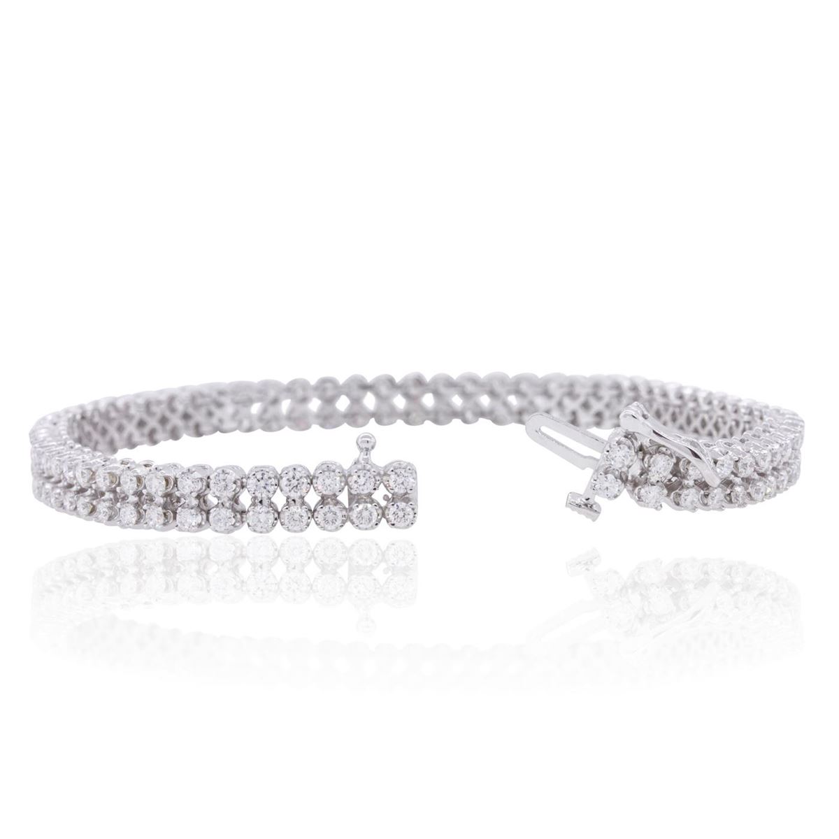 One electronically tested 14KT white gold ladies cast & assembled diamond bracelet with a bright polish finish. Seven inch length bracelet features two flexible diamond ribbons, terminating in a concealed clasp with safety. Identified with markings of 14K. Condition is new, good workmanship. Containing: One Hundred Thirty prong set round brilliant cut diamonds, measuring 1.90 - 1.80 x 1.11mm (depth est.) approximate total weight of 130 Stones = 3.10ct. Graded in the setting. Clarity: SI-1 to I-1. Color: G - I. Total Weight of Diamonds 3.10ct. Total Weight of Bracelet 16.50 grams. AIG Appraised at $11,725.00.