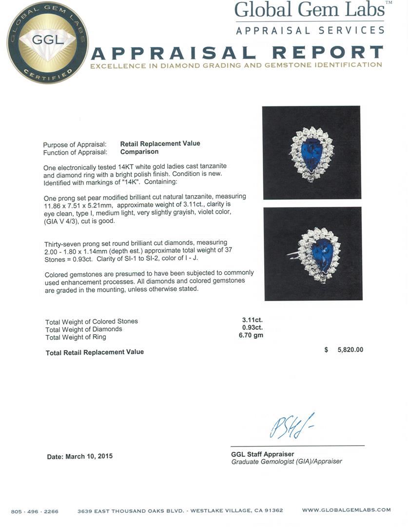 One electronically tested 14KT white gold ladies cast tanzanite and diamond ring with a bright polish finish. Identified with markings of "14K". Condition is new. Containing: One prong set pear modified brilliant cut natural tanzanite, measuring 11.86 x 7.51 x 5.21mm, approximate weight of 3.11ct., clarity is eye clean, type I, medium light, very slightly grayish, violet color, (GIA V 4/3), cut is good. Thirty-Seven prong set round brilliant cut diamonds, measuring 2.00 - 1.80 x 1.14mm (depth est.) approximate total weight of 37 Stones = 0.93ct. Clarity: SI-1 to SI-2. Color: I - J. Colored gemstones are presumed to have been subjected to commonly used enhancement processes. All diamonds and colored gemstones are graded in the mounting, unless otherwise stated. Total Weight of Colored Stones 3.11ct. Total Weight of Diamonds 0.93ct. Total Weight of Ring 6.70 grams. GGL Appraised at $5,820.00.