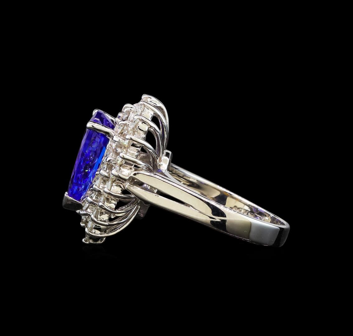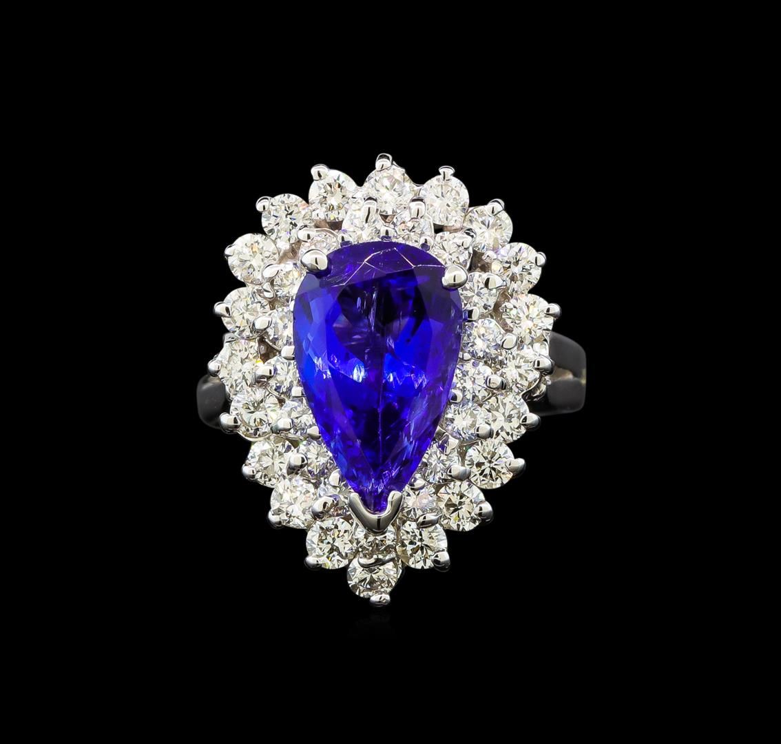 One electronically tested 14KT white gold ladies cast tanzanite and diamond ring with a bright polish finish. Identified with markings of "14K". Condition is new. Containing: One prong set pear modified brilliant cut natural tanzanite, measuring 11.86 x 7.51 x 5.21mm, approximate weight of 3.11ct., clarity is eye clean, type I, medium light, very slightly grayish, violet color, (GIA V 4/3), cut is good. Thirty-Seven prong set round brilliant cut diamonds, measuring 2.00 - 1.80 x 1.14mm (depth est.) approximate total weight of 37 Stones = 0.93ct. Clarity: SI-1 to SI-2. Color: I - J. Colored gemstones are presumed to have been subjected to commonly used enhancement processes. All diamonds and colored gemstones are graded in the mounting, unless otherwise stated. Total Weight of Colored Stones 3.11ct. Total Weight of Diamonds 0.93ct. Total Weight of Ring 6.70 grams. GGL Appraised at $5,820.00.