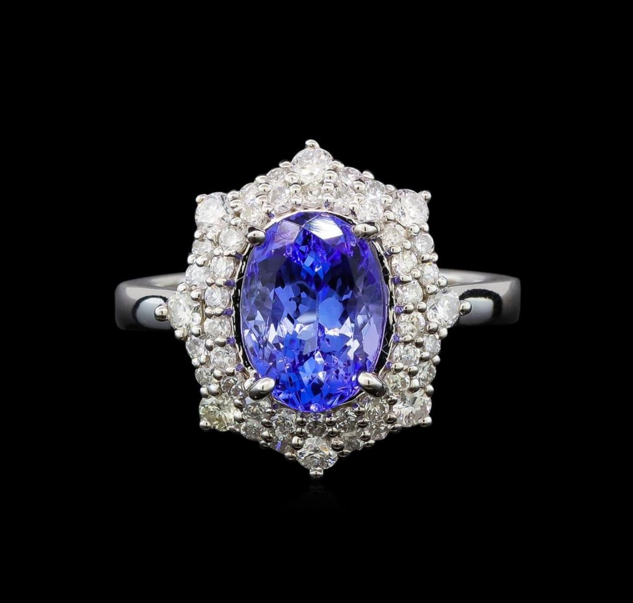 One electronically tested 14KT white gold ladies cast tanzanite and diamond ring with a bright polish finish. Identified with markings of "14K". Condition is new. Containing: One prong set oval modified brilliant cut natural tanzanite, measuring 10.00 x 7.50 x 5.90mm, approximate weight of 3.11ct., clarity is eye clean, type I, medium light, very slightly grayish, violet color, (GIA V 4/3), cut is good. Forty-Six prong set round brilliant cut diamonds, measuring 1.90 - 1.30 x 0.96mm (depth est.) approximate total weight of 46 Stones = 0.50 ct. Clarity: SI-2 to I-2. Color: I - J, Cut is Good. Colored gemstones are presumed to have been subjected to commonly used enhancement processes. All diamonds and colored gemstones are graded in the mounting, unless otherwise stated. Total Weight of Colored Stones 3.11ct. Total Weight of Diamonds 0.50 ct. Total Weight of Ring 6.75 grams. GGL Appraised.