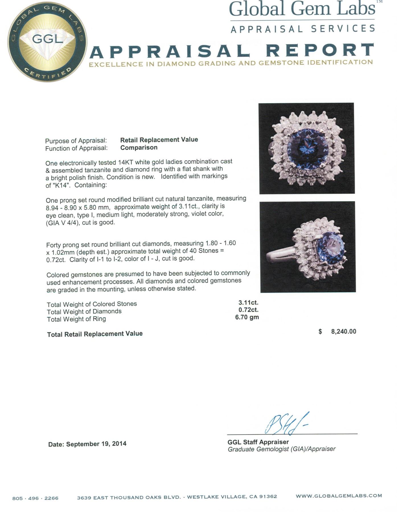 One electronically tested 14KT white gold ladies combination cast & assembled tanzanite and diamond ring with a flat shank with a bright polish finish. Identified with markings of "K14". Condition is new. Containing: One prong set round modified brilliant cut natural tanzanite, measuring 8.94 - 8.90 x 5.80 mm, approximate weight of 3.11ct., clarity is eye clean, type I, medium light, moderately strong, violet color, (GIA V 4/4), cut is good. Forty prong set round brilliant cut diamonds, measuring 1.80 - 1.60 x 1.02mm (depth est.) approximate total weight of 40 Stones = 0.72ct. Clarity: I-1 to I-2. Color: I - J, Cut is Good. Colored gemstones are presumed to have been subjected to commonly used enhancement processes. All diamonds and colored gemstones are graded in the mounting, unless otherwise stated. Total Weight of Colored Stones 3.11ct. Total Weight of Diamonds 0.72ct. Total Weight of Ring 6.70 grams. GGL Appraised.