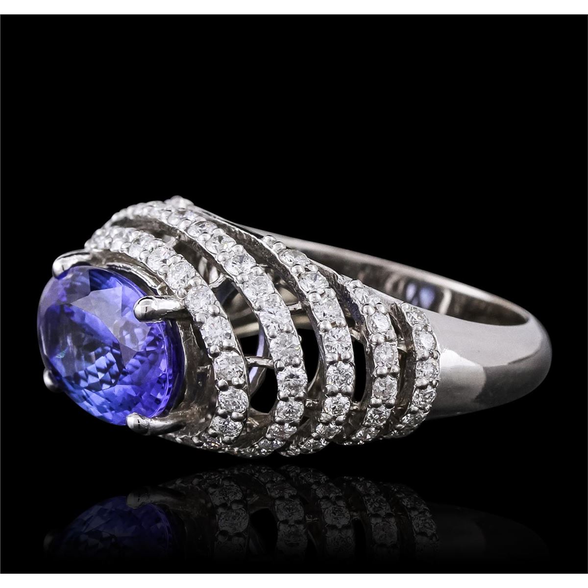 One electronically tested 14KT white gold ladies combination cast & assembled ring with a bright polish finish. Condition is new. Identified with markings of "14K". Containing: One prong set oval modified brilliant cut natural tanzanite, measuring 11.90 x 7.80 x 4.78mm, approximate weight of 3.11ct., clarity is eye clean, type I, medium, moderately strong, violetish blue color, (GIA vB 5/4), cut is good. Ninety prong set round brilliant cut diamonds, measuring 1.40 - 1.40 x 0.84mm (depth est.) approximate total weight of 90 Stones = 0.90ct. Clarity: I-1 to I-2. Color: H - I, Cut is Good. Colored gemstones are presumed to have been subjected to commonly used enhancement processes. All diamonds and colored gemstones are graded in the mounting, unless otherwise stated. Total Weight of Colored Stones 3.11ct. Total Weight of Diamonds 0.90ct. Total Weight of Ring 7.30 grams. GGL Appraised at $8,145.00.