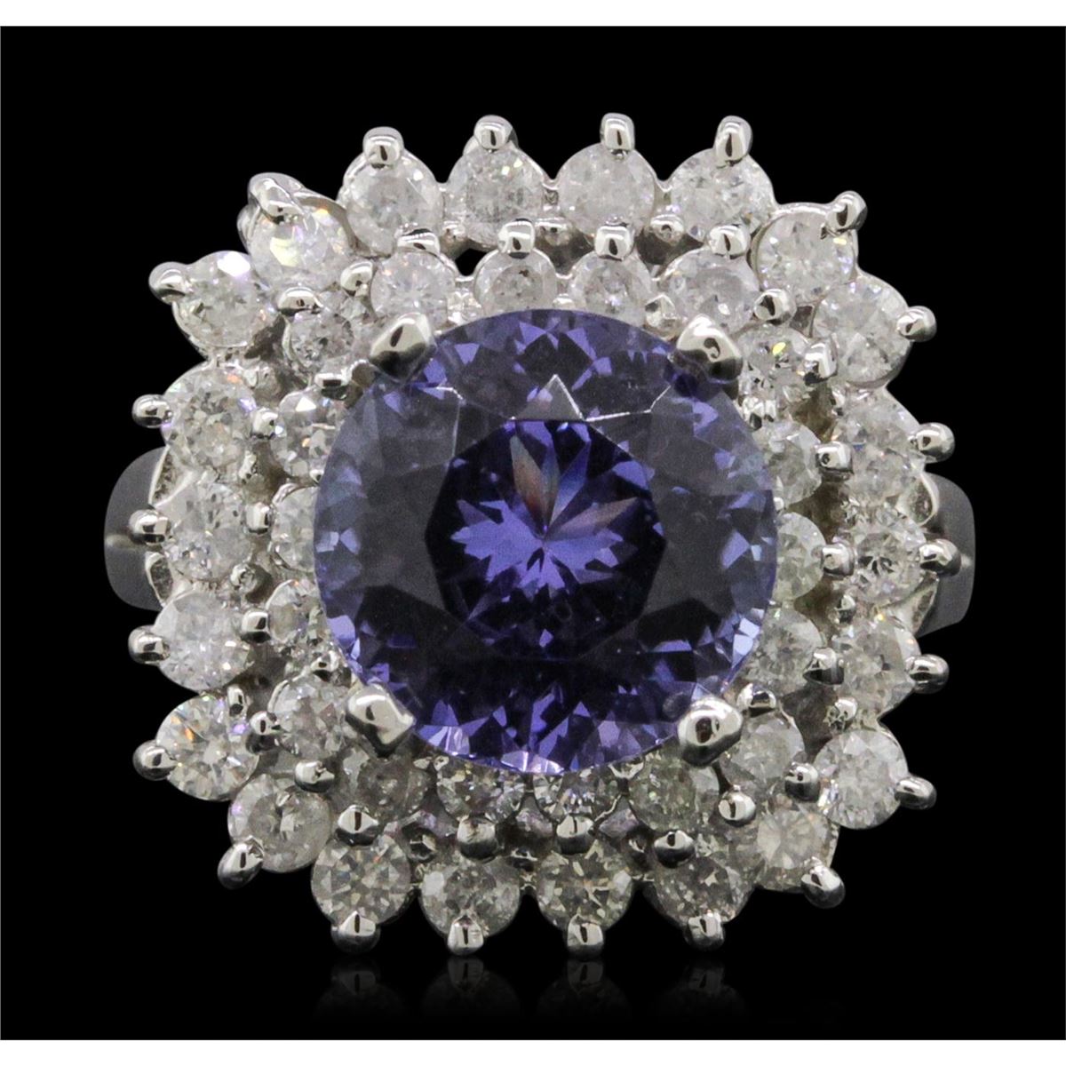One electronically tested 14KT white gold ladies combination cast & assembled tanzanite and diamond ring with a flat shank with a bright polish finish. Identified with markings of "K14". Condition is new. Containing: One prong set round modified brilliant cut natural tanzanite, measuring 8.94 - 8.90 x 5.80 mm, approximate weight of 3.11ct., clarity is eye clean, type I, medium light, moderately strong, violet color, (GIA V 4/4), cut is good. Forty prong set round brilliant cut diamonds, measuring 1.80 - 1.60 x 1.02mm (depth est.) approximate total weight of 40 Stones = 0.72ct. Clarity: I-1 to I-2. Color: I - J, Cut is Good. Colored gemstones are presumed to have been subjected to commonly used enhancement processes. All diamonds and colored gemstones are graded in the mounting, unless otherwise stated. Total Weight of Colored Stones 3.11ct. Total Weight of Diamonds 0.72ct. Total Weight of Ring 6.70 grams. GGL Appraised at $8,240.00.