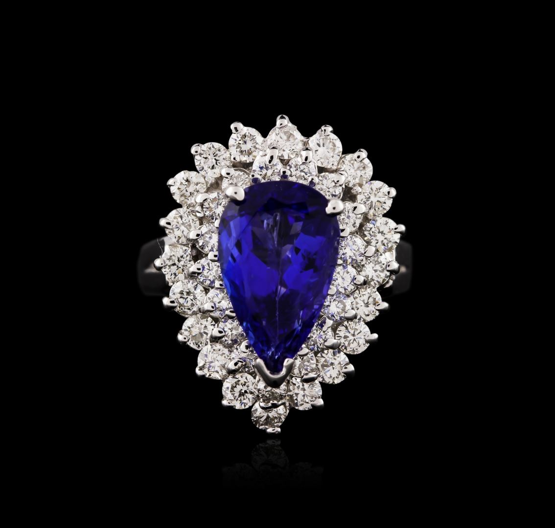 One electronically tested 14KT white gold ladies cast tanzanite and diamond ring with a bright polish finish. Identified with markings of "14K". Condition is new. Containing: One prong set pear modified brilliant cut natural tanzanite, measuring 11.86 x 7.51 x 5.21mm, approximate weight of 3.11ct., clarity is eye clean, type I, medium light, very slightly grayish, violet color, (GIA V 4/3), cut is good. Thirty-Seven prong set round brilliant cut diamonds, measuring 2.00 - 1.80 x 1.14mm (depth est.) approximate total weight of 37 Stones = 0.93ct. Clarity: SI-1 to SI-2. Color: I - J. Colored gemstones are presumed to have been subjected to commonly used enhancement processes. All diamonds and colored gemstones are graded in the mounting, unless otherwise stated. Total Weight of Colored Stones 3.11ct. Total Weight of Diamonds 0.93ct. Total Weight of Ring 6.70 grams. GGL Appraised at $5,820.00.