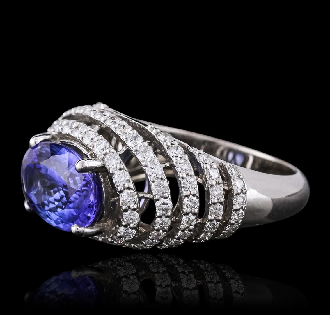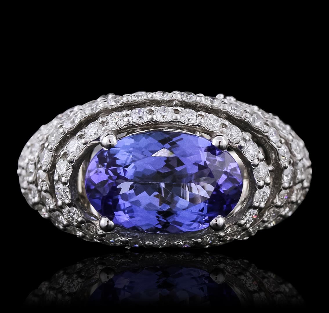 One electronically tested 14KT white gold ladies combination cast & assembled ring with a bright polish finish. Condition is new. Identified with markings of "14K". Containing: One prong set oval modified brilliant cut natural tanzanite, measuring 11.90 x 7.80 x 4.78mm, approximate weight of 3.11ct., clarity is eye clean, type I, medium, moderately strong, violetish blue color, (GIA vB 5/4), cut is good. Ninety prong set round brilliant cut diamonds, measuring 1.40 - 1.40 x 0.84mm (depth est.) approximate total weight of 90 Stones = 0.90ct. Clarity: I-1 to I-2. Color: H - I, Cut is Good. Colored gemstones are presumed to have been subjected to commonly used enhancement processes. All diamonds and colored gemstones are graded in the mounting, unless otherwise stated. Total Weight of Colored Stones 3.11ct. Total Weight of Diamonds 0.90ct. Total Weight of Ring 7.30 grams. GGL Appraised at $8,145.00.