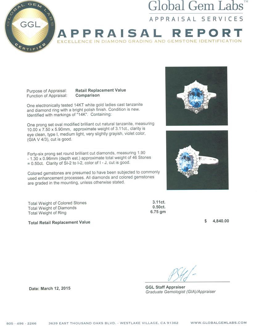One electronically tested 14KT white gold ladies cast tanzanite and diamond ring with a bright polish finish. Identified with markings of "14K". Condition is new. Containing: One prong set oval modified brilliant cut natural tanzanite, measuring 10.00 x 7.50 x 5.90mm, approximate weight of 3.11ct., clarity is eye clean, type I, medium light, very slightly grayish, violet color, (GIA V 4/3), cut is good. Forty-Six prong set round brilliant cut diamonds, measuring 1.90 - 1.30 x 0.96mm (depth est.) approximate total weight of 46 Stones = 0.50ct. Clarity: SI-2 to I-2. Color: I - J, Cut is Good. Colored gemstones are presumed to have been subjected to commonly used enhancement processes. All diamonds and colored gemstones are graded in the mounting, unless otherwise stated. Total Weight of Colored Stones 3.11ct. Total Weight of Diamonds 0.50ct. Total Weight of Ring 6.75 grams. GGL Appraised at $4,840.00.