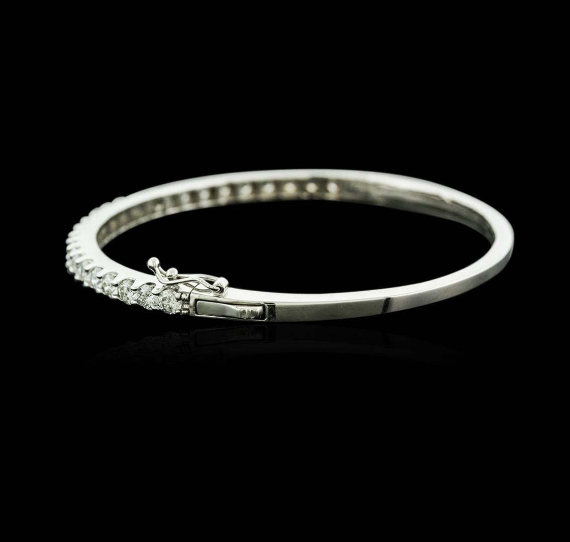 One electronically tested 14KT white gold ladies cast diamond bangle bracelet with a hidden box clasp with safety closer with a bright polish finish. Condition is new. Containing: Twenty-Six prong set round brilliant cut diamonds, measuring 3.20 - 3.20 x 1.92mm (depth est.) approximate total weight of 26 Stones = 3.12ct. Clarity: SI-1 to I-1. Color: H - J, Cut is Good. All diamonds are graded in the mounting, unless otherwise stated. Total Weight of Diamonds 3.12ct. Total Weight of Bangle Bracelet 13.40 grams. GGL Appraised at $8,520.00.