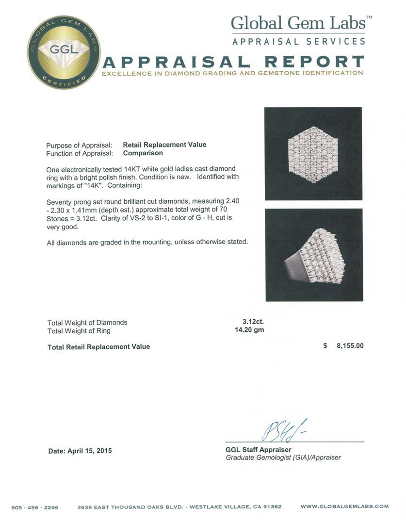 One electronically tested 14KT white gold ladies cast diamond ring with a bright polish finish. Identified with markings of "14K". Condition is new. Containing: Seventy prong set round brilliant cut diamonds, measuring 2.40 - 2.30 x 1.41mm (depth est.) approximate total weight of 70 Stones = 3.12ct. Clarity: VS-2 to SI-1. Color: G - H, Cut is Very Good. All diamonds are graded in the mounting, unless otherwise stated. Total Weight of Diamonds 3.12ct. Total Weight of Ring 14.20 grams. GGL Appraised at $8,155.00.