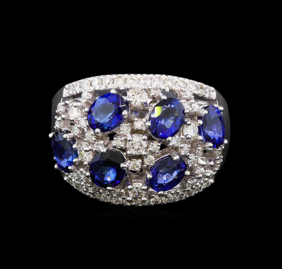 One electronically tested 14KT white gold ladies cast sapphire and diamond ring with a bright polish finish. Identified with markings of "K14". Condition is new. Containing: Six prong set oval modified brilliant cut natural blue sapphires, measuring 6.00 x 4.00 x 2.60mm, approximate total weight of 3.12ct., clarity is slightly included, type II, medium, moderately strong, blue color, (GIA B 5/4), cut is good. Fifty-Nine prong set round brilliant cut diamonds, measuring 1.80 - 1.10 x 0.87mm (depth est.) approximate total weight of 59 Stones = 0.66ct. Clarity: SI-1 to I-1. Color: I - J, Cut is Good. Colored gemstones are presumed to have been subjected to commonly used enhancement processes. All diamonds and colored gemstones are graded in the mounting, unless otherwise stated. Total Weight of Colored Stones 3.12ct. Total Weight of Diamonds 0.66ct. Total Weight of Ring 8.40 grams. GGL Appraised at $5,160.00.
