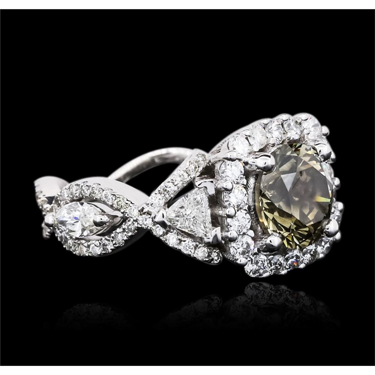 One electronically tested 14KT white gold ladies cast diamond ring. The featured diamond is set within a diamond bezel supported by stylized intertwining diamond shoulders, completed by a one and on-half millimeter wide band. Identified with markings of "14K". Containing: One prong set round brilliant cut diamond, measuring 7.15 - 7.05 x 4.90mm (depth est.), 4.00.%. GTCF approximate weight of 1.66ct. Graded in the setting. Clarity: I-1 Two prong set triangle brilliant cut diamonds, measuring 3.60 x 3.40 x 2.11mm (depth est.) approximate total weight of 2 Stones = 0.35ct. Graded in the setting. Clarity: VS-2. Color: G Two prong set marquise shaped cut diamonds, measuring 4.50 x 2.50 x 1.58mm (depth est.) approximate total weight of 2 Stones = 0.25ct. Graded in the setting. Clarity: VS-2. Color: G Eighteen prong set round brilliant cut diamonds, measuring 1.80 - 1.70 x 1.05mm (depth est.) approximate total weight of 18 Stones = 0.45ct. Graded in the setting. Clarity: VS-1 to SI-1. Color: G - H Seventy-Four prong set round brilliant cut diamonds, measuring 1.10 - 1.00 x 0.63mm (depth est.) approximate total weight of 74 Stones = 0.41ct. Graded in the setting. Clarity: VS-1 to VS-2. Color: G - I. Total Weight of Diamonds 3.12ct. Total Weight of Ring 4.77 grams. AIG Appraised at $14,040.00.