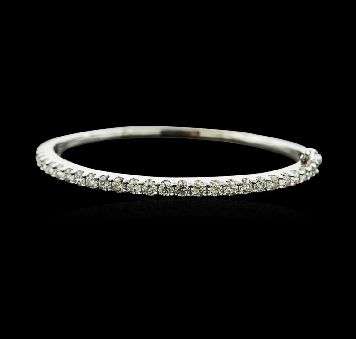 One electronically tested 14KT white gold ladies cast diamond bangle bracelet with a hidden box clasp with safety closer with a bright polish finish. Condition is new. Containing: Twenty-Six prong set round brilliant cut diamonds, measuring 3.20 - 3.20 x 1.92mm (depth est.) approximate total weight of 26 Stones = 3.12ct. Clarity: SI-1 to I-1. Color: H - J, Cut is Good. All diamonds are graded in the mounting, unless otherwise stated. Total Weight of Diamonds 3.12ct. Total Weight of Bangle Bracelet 13.40 grams. GGL Appraised at $8,520.00.